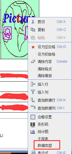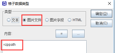 2、在需要的报表格子里设置图片展示,右键->数据类型,选择“图片文件”,“=参数名称”,点击确定