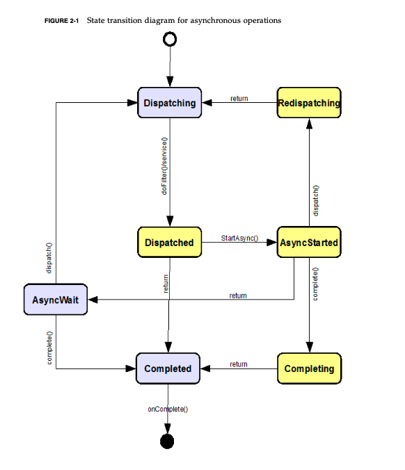 将异步的Servlet传递给同步的Servlet是允许的,费异步的Servlet在执行完service方法后,就完成了请求。Servlet Container的有义务调用AsyncContext.complete()来通知AsyncListener监听者,监听者则可以清理资源。
