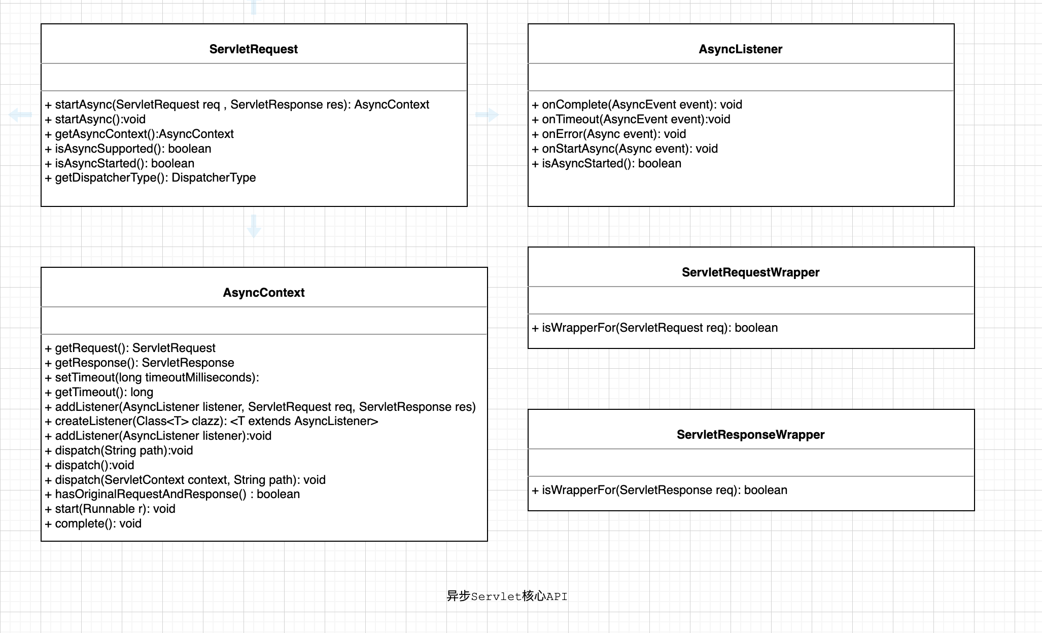 • public AsyncContext startAsync(ServletRequest req, ServletResponse res),这个方法将请求置于异步处理模式,并且根据给定的request和response构建AsyncContext对象。AsyncContext对象getAsyncTimeOut方法返回超时时间。
