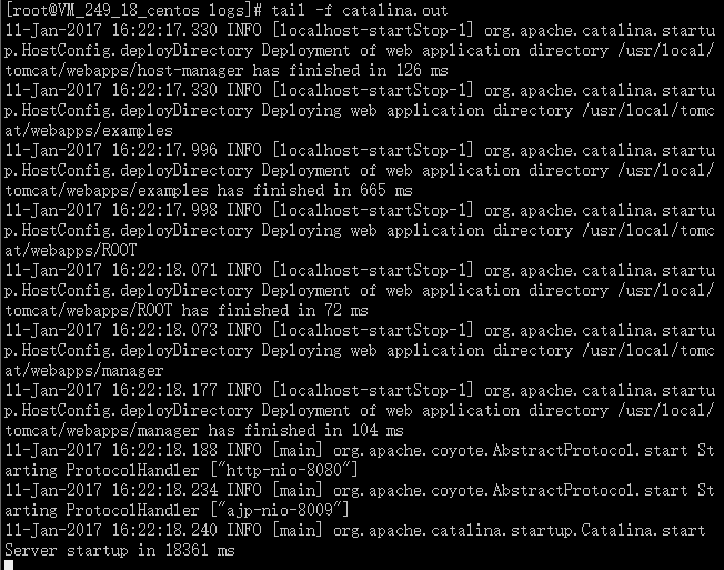 输入ls可以看到目录下有个catalina.out文件,该文件就是记录运行时的各种信息,在tomcat运行时,进入该目录,查看该文件内容,即可实时看到tomcat运行的各种打印以及提示信息