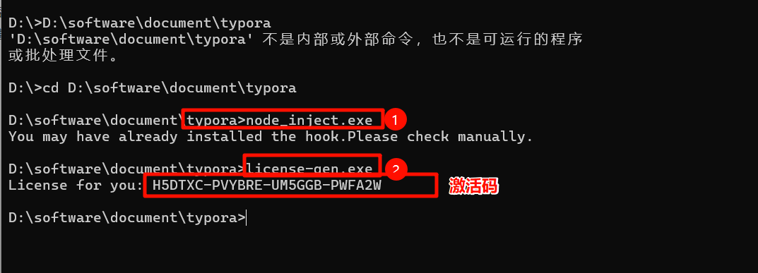 将这两个软件复制到 typora的安装位置,管理员运行 cmd,切换到typora安装位置,先运行 node_inject.exe ,窗口出现 done 表示运行完成,然后运行 license-gen.exe 软件,窗口中出现激活码,将激活码复制到 typora中即可,邮箱随便填写。