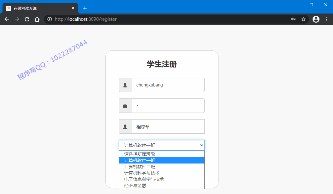 - 学生自行注册并选中所属班级,注册登录后能看到自己所属班级是有考试