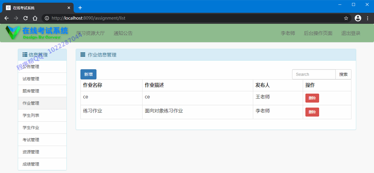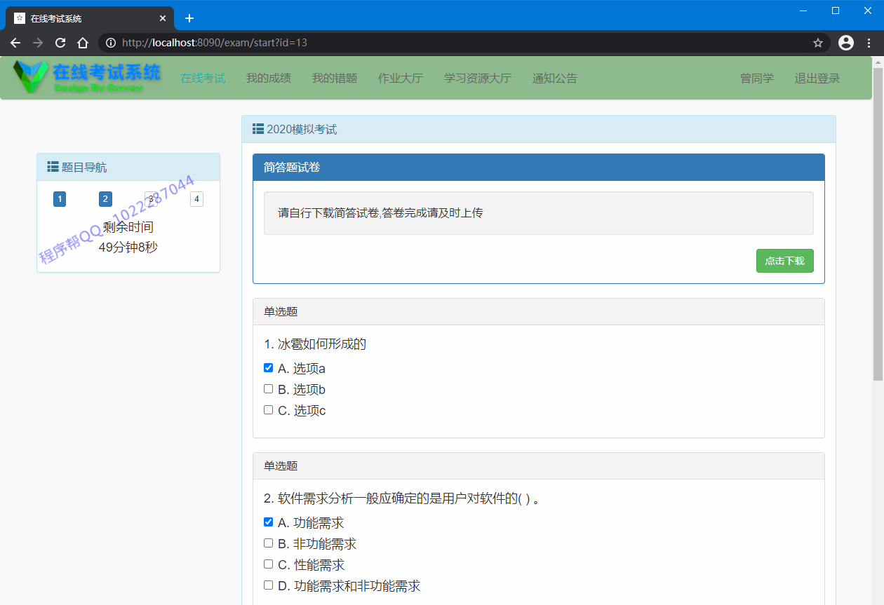 springmvc实战在线考试系统,学生自主注册账号,选择自己所在班级,进行在线模拟考试。 项目主要分为用户管理,资源管理,考试管理,试卷管理,作业管理,成绩管理等几个大的模块,针对每个模块划分管理员、教室、学生三种角色,给予每个不同角色相应的页面,操作逻辑以及权限。