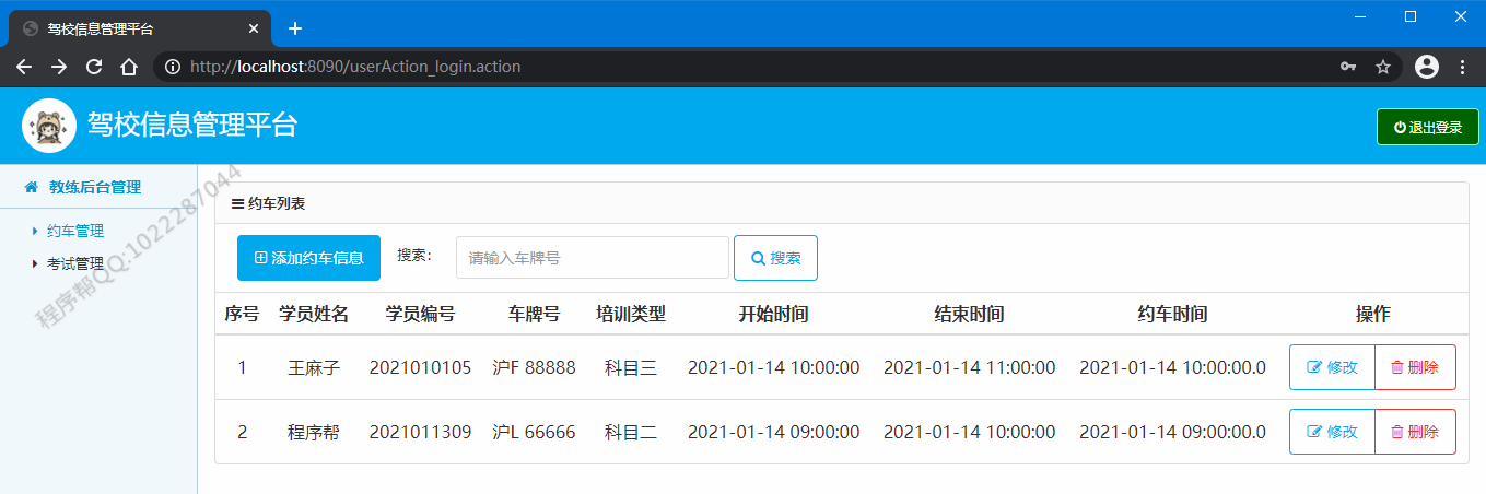 本系统使用Struts2+Spring+Hibernate架构,数据库使用MySQL,连接池使用c3p0。广泛用于驾校管理,包含学员管理、车辆管理、教练员工管理、用车管理、考试管理、成绩缴费管理等功能,除了管理员能控制修改这些信息以外,教练也可对其下学员的约车信息和考试管理信息进行增删改查。