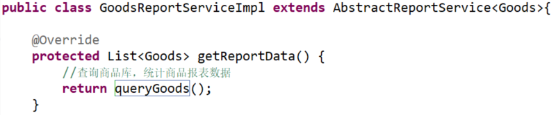 可以看到,报表导出方法分为四步,被抽成四个方法,有三个公共方法,一个抽象方法为查询报表数据,由于不同的报表,数据查询逻辑不一样,所以它应该被作为抽象方法,由子类去实现。子类只需要实现该抽象方法即可,比如订单子类就去查询并统计订单库,商品子类就去查询并统计商品库: