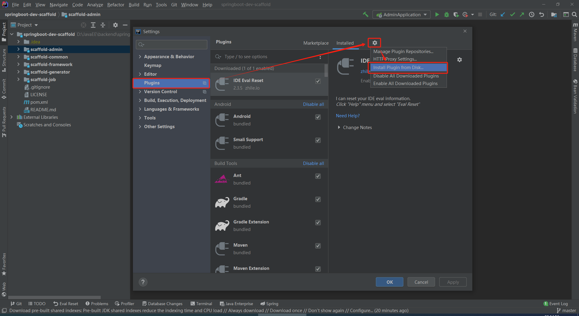 2、打开 IDEA 插件中心,并选择从本地磁盘安装,安装完成后重启 IDEA