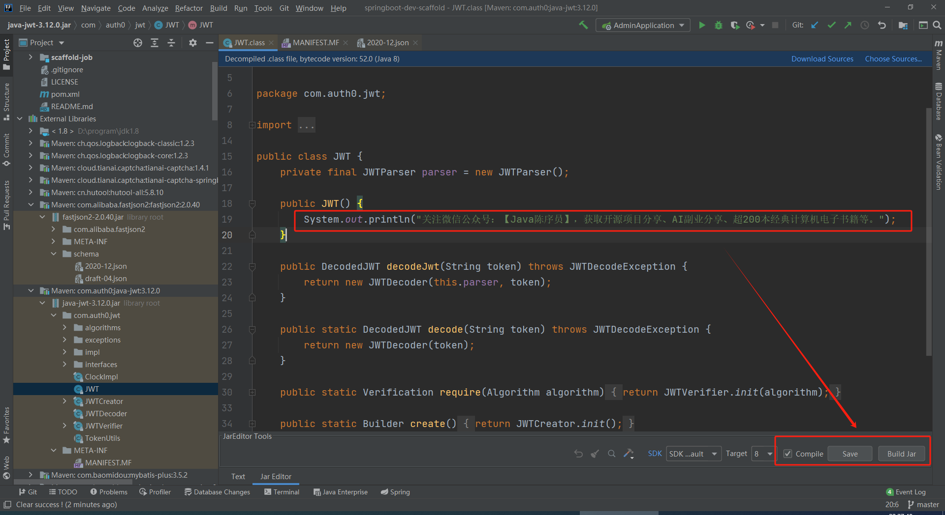 2、打开后,可直接编辑修改文件,修改好后点击Save(Compile),编译并保存当前修改的 Java 内容,最后点击Build Jar,将编译保存的类文件写入 Jar 包中