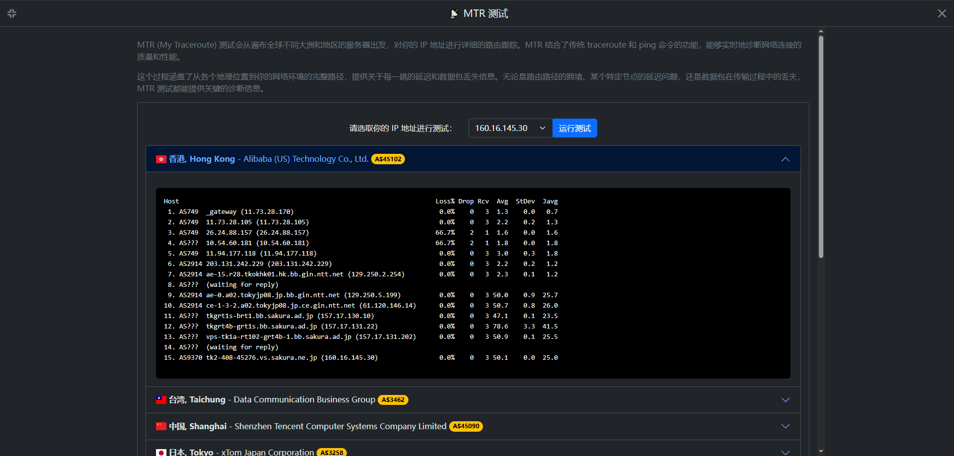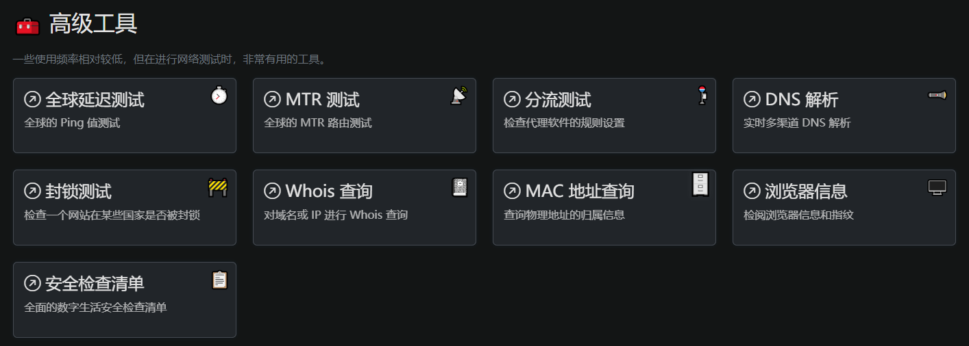 - 高级工具:提供一些非常有用的网络测试工具,例如全球延迟测试、MTR 测试、DNS 解析、Whois 查询等