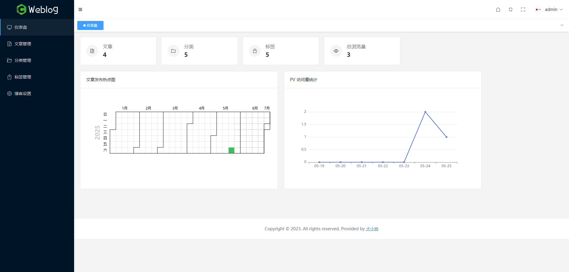 - 支持仪表盘数据统计,Echarts 文章发布热图统计、PV 访问量统计等