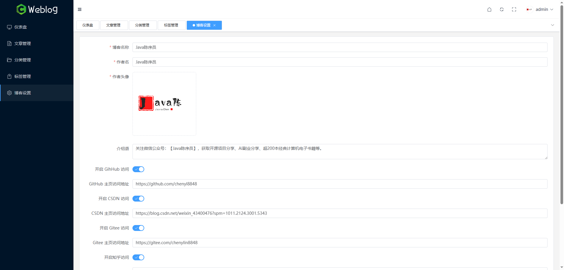 - 支持博客个人基本信息的设置,提供社交主页的跳转