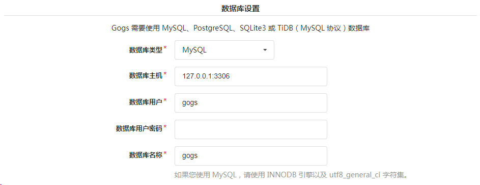 1、数据库设置:Gogs 使用 MySQL、PostgreSQL、SQLite3(无需安装配置) 等类型的数据库,需要配置数据库的连接信息