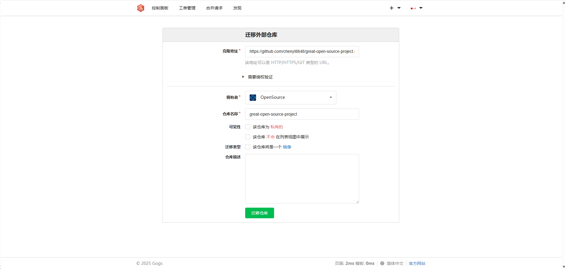 2、仓库:管理代码仓库,支持迁移外部仓库。