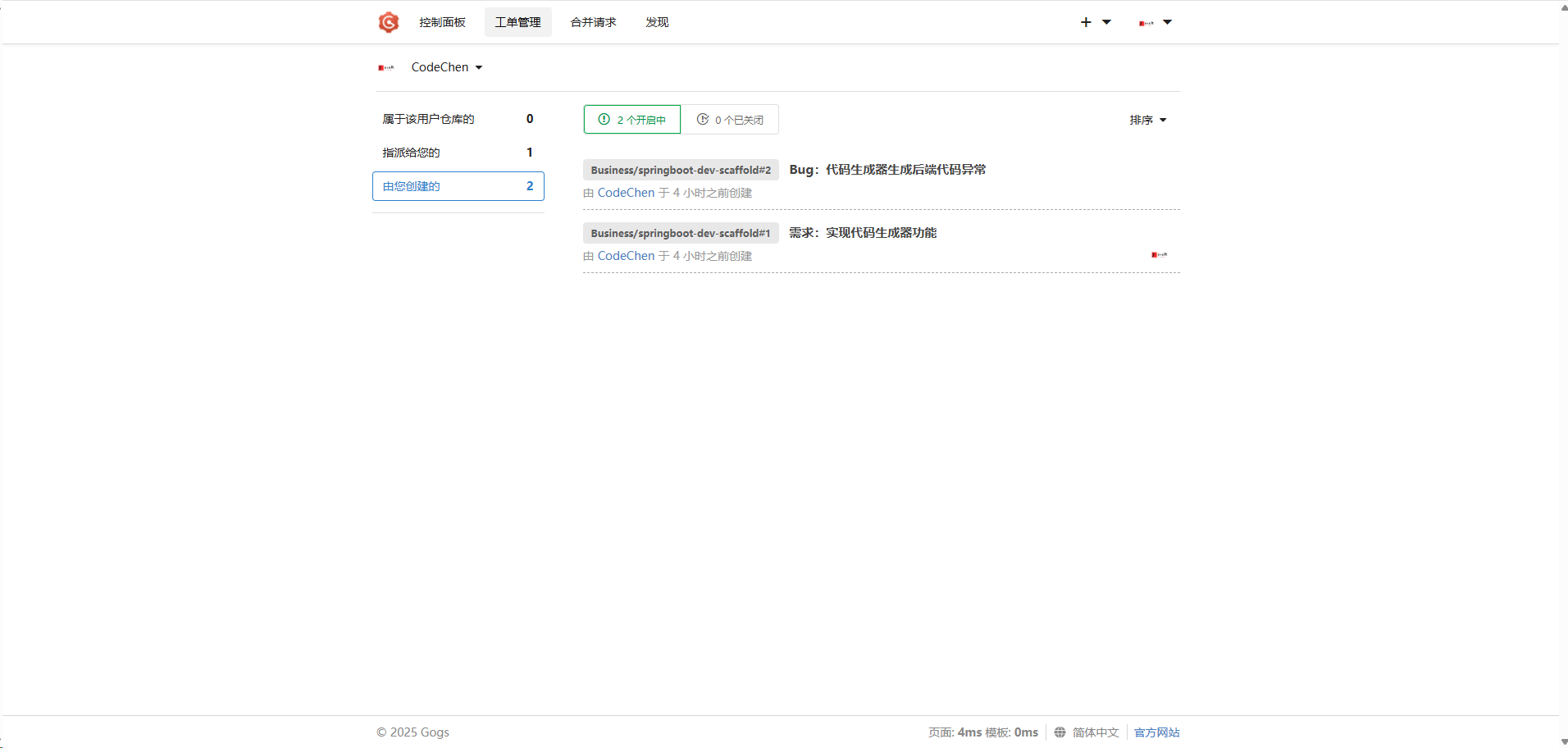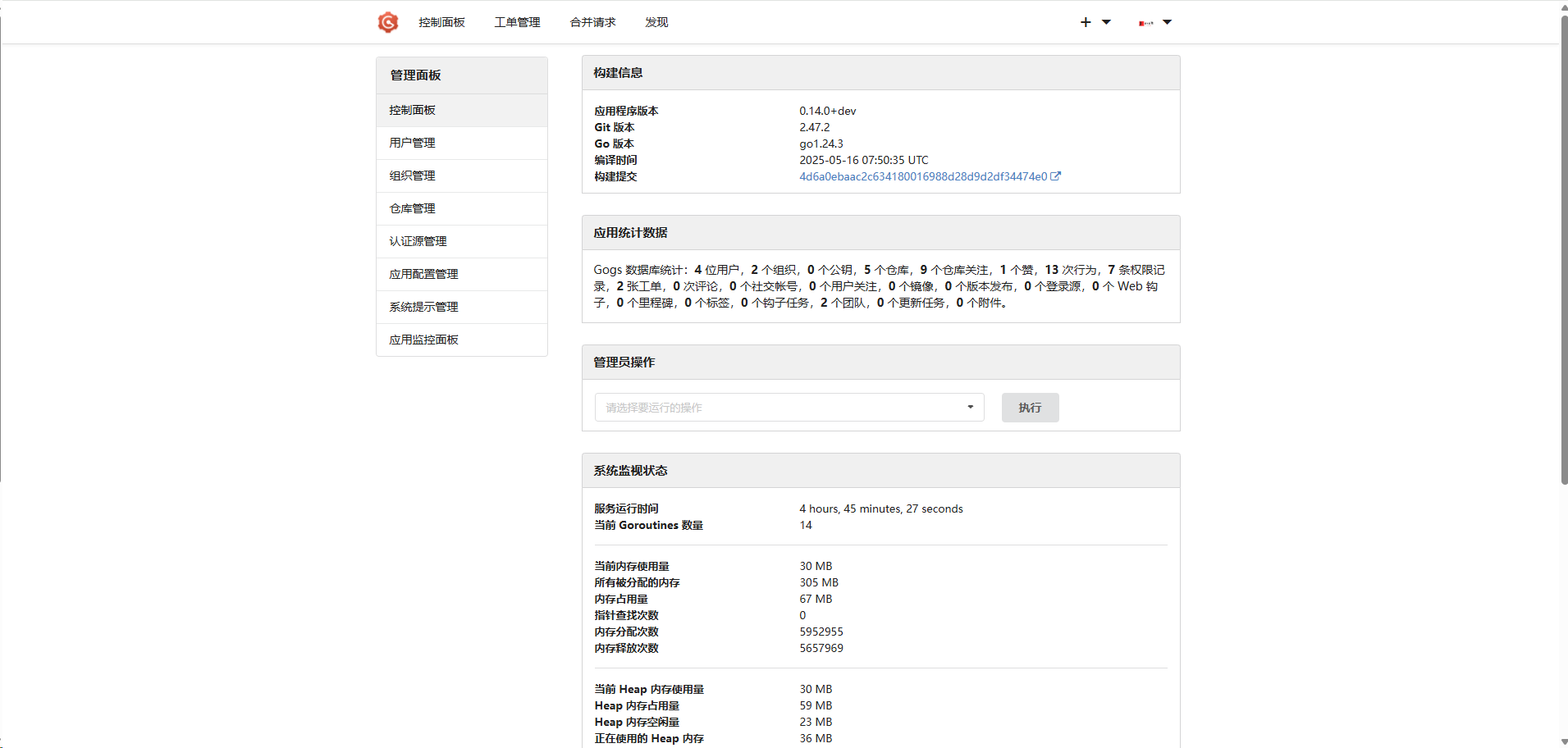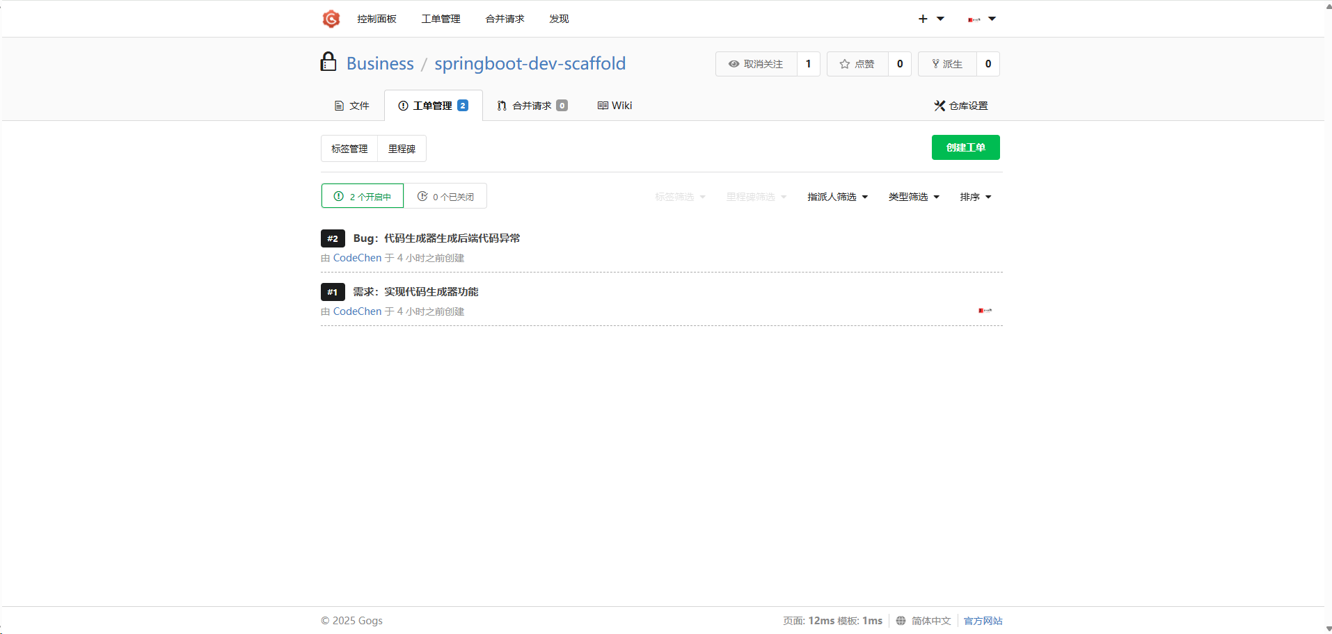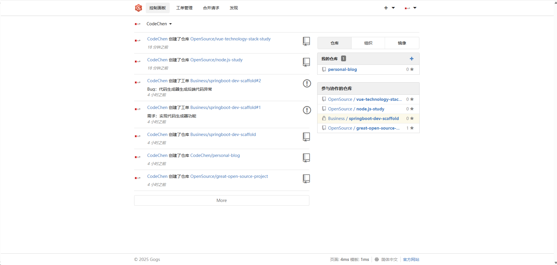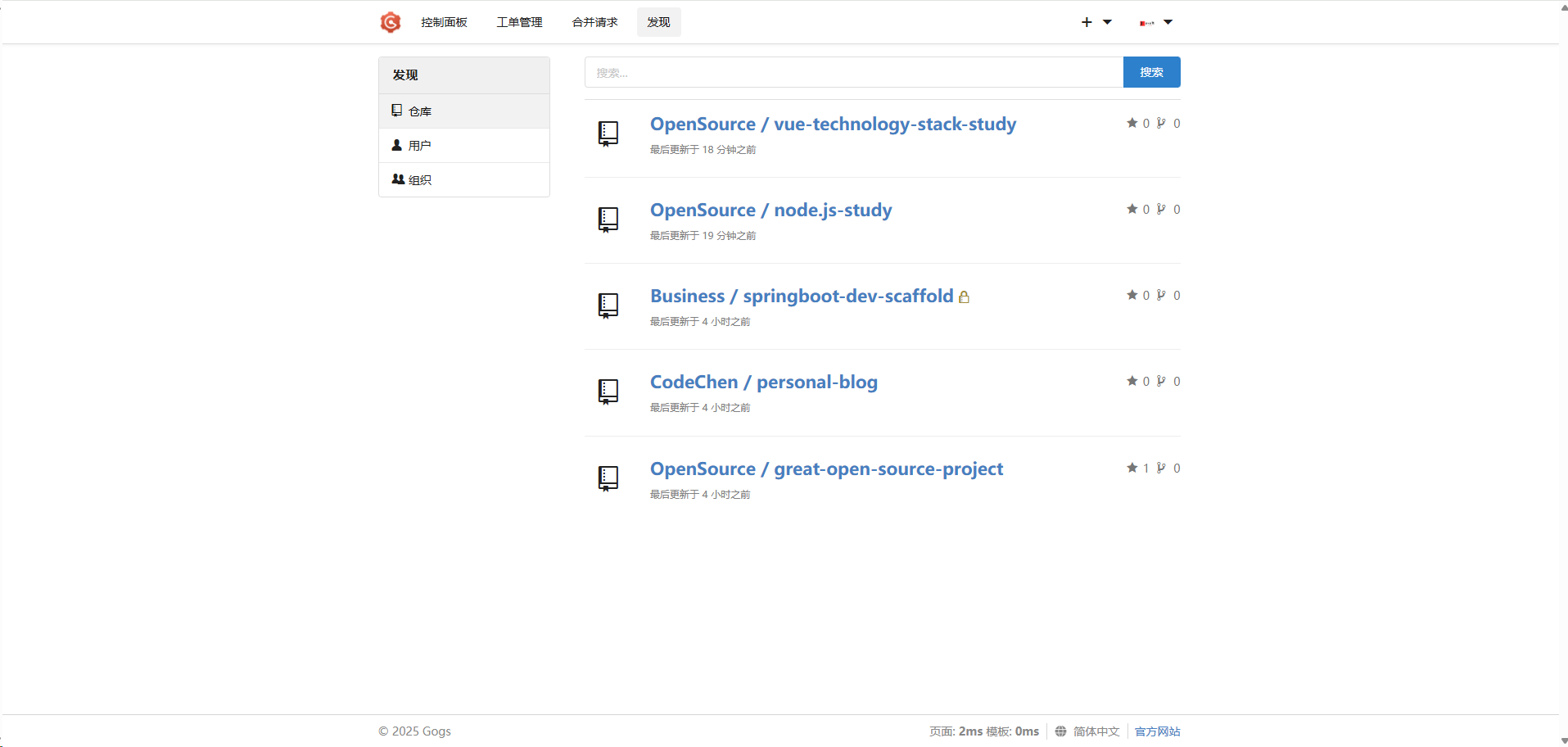 Gogs 与常用的 Github、Gitlab 等功能类似,都具备组织、仓库、用户等层次结构关系,而且支持工单管理的功能。