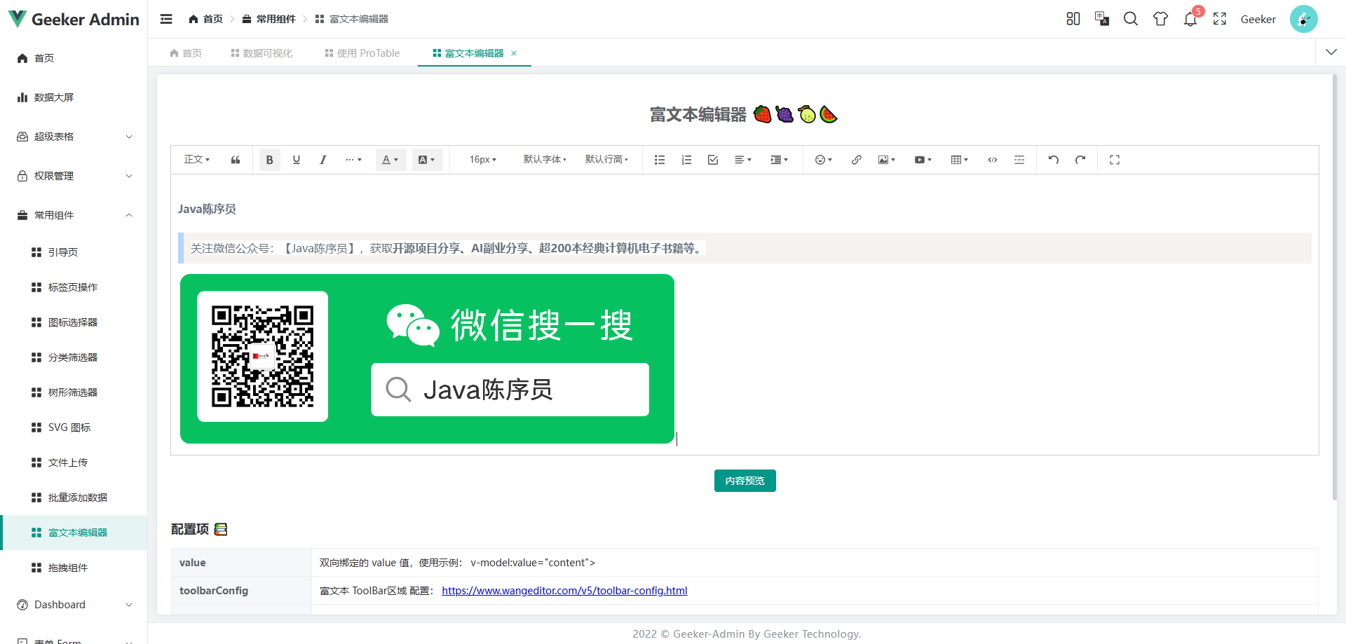 - 丰富的组件:基于 Element 二次封装 ProTable 组件,表格页面全部为配置项 Columns,提供强大功能,如打印、列对齐方式功能;还提供图标选择组件、图片上传组件及其属性、分类筛选器、wangEditor 富文本编辑器(完成二次封装)等