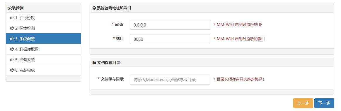 3、系统配置,自定义配置 MM-Wiki 的地址、端口,以及文档存放位置