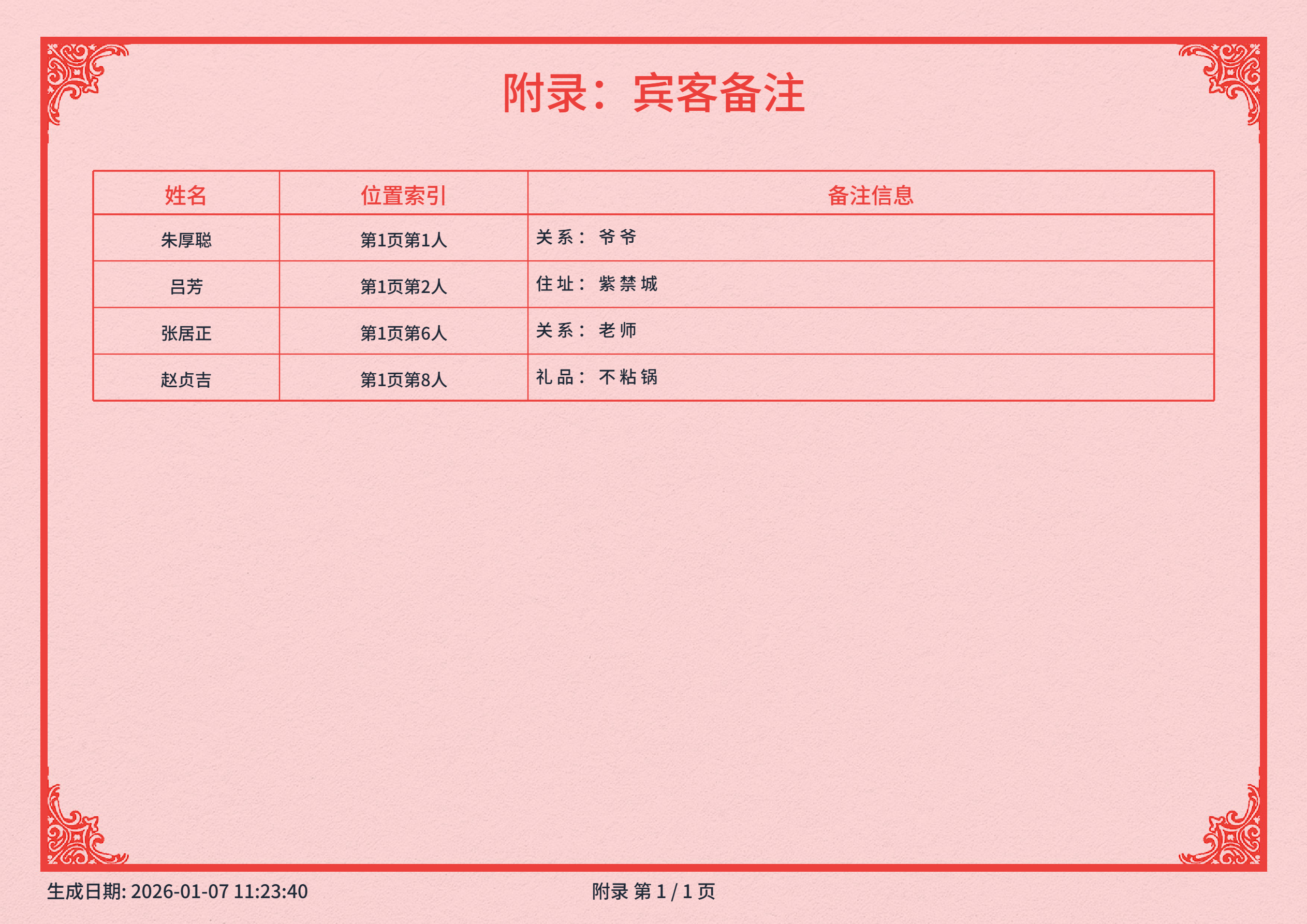 - 专业级报表与归档:内置专业 PDF 引擎,生成的电子礼簿支持自定义字体、封面图、背景纹理,支持导出加密数据文件,跨设备可全量恢复