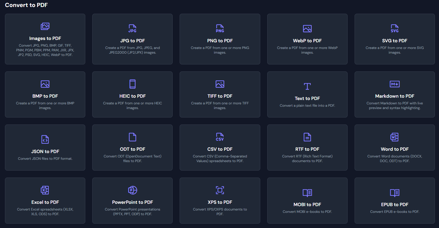 提供图片、文本、Markdown、Word 等格式文档转换为 PDF 工具。