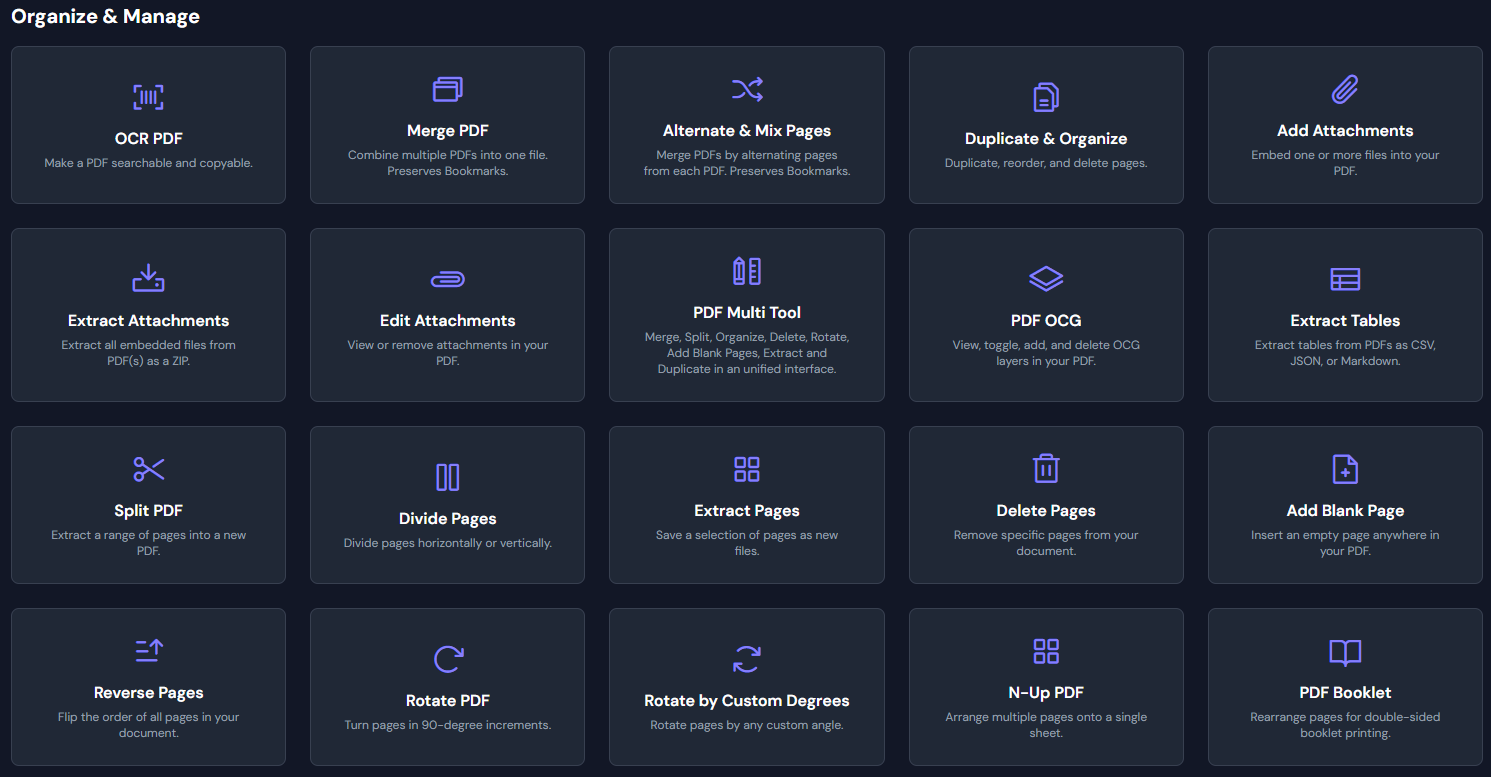 提供 PDF 合并、拆分、整理、旋转、删除、旋转、添加空白页等工具。