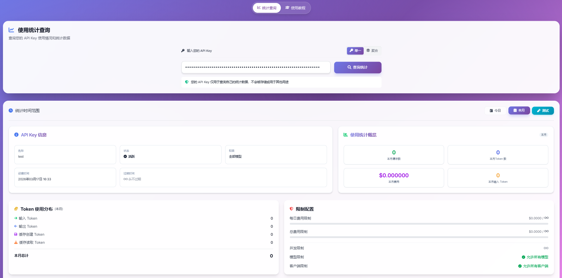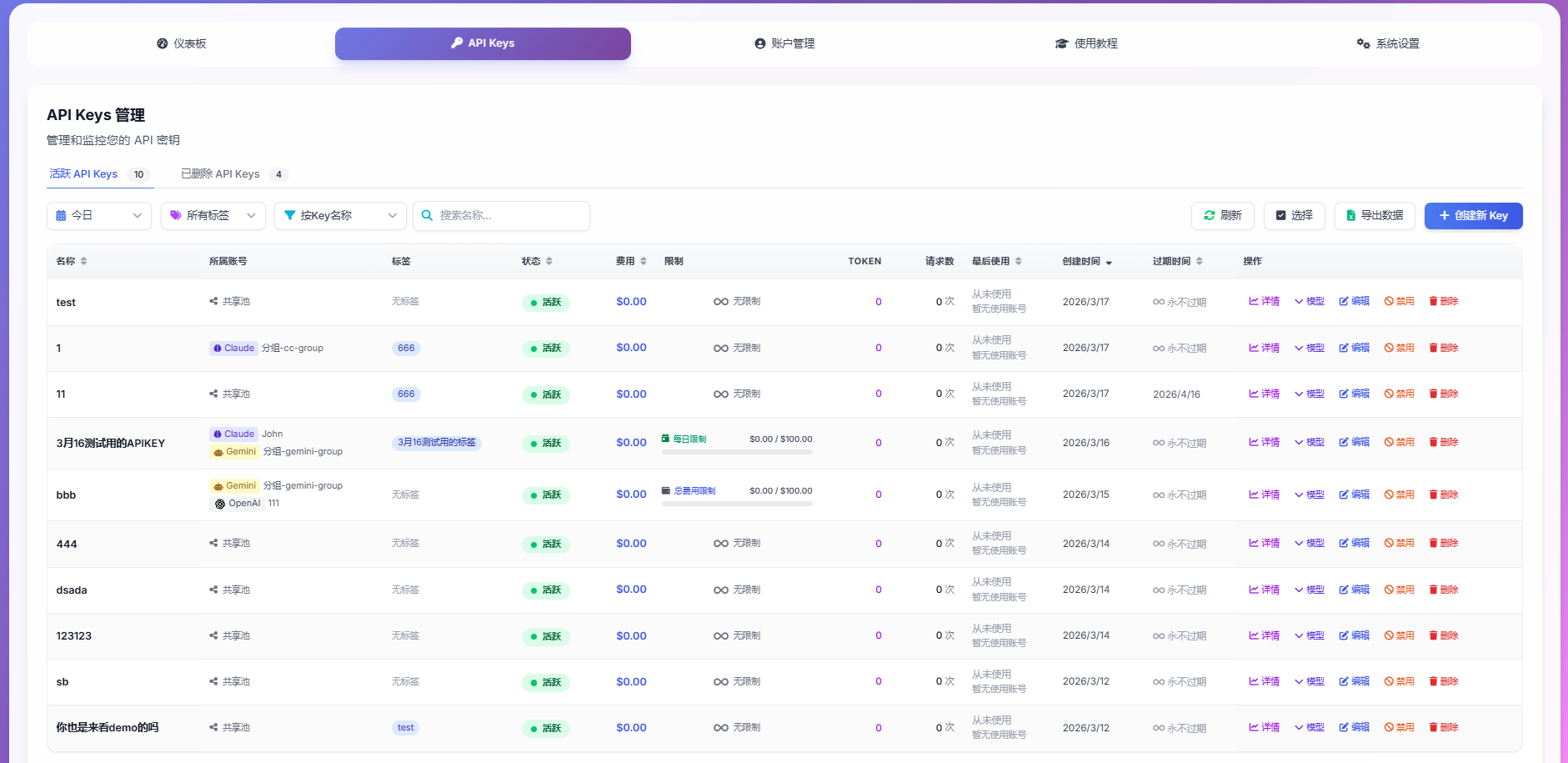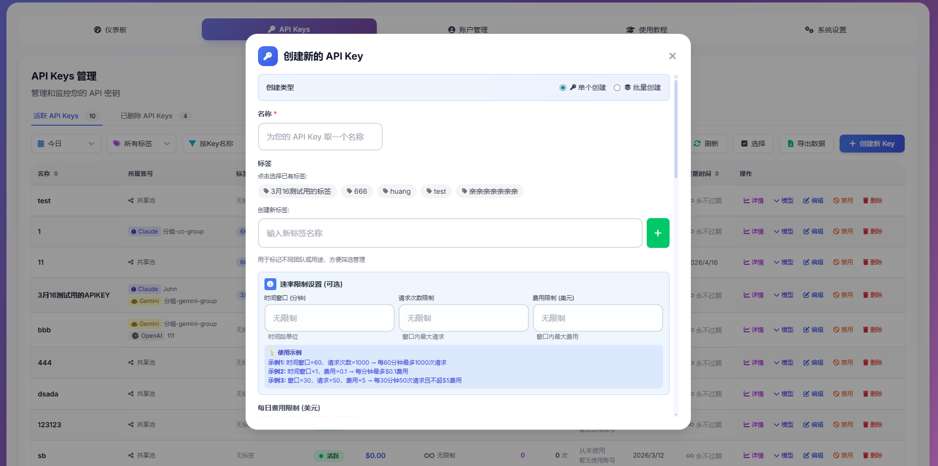 - 精细化权限管控:自定义 API Key 生成,为每个用户/团队分配独立 API Key,支持设置 Token 限额、并发数、速率限制