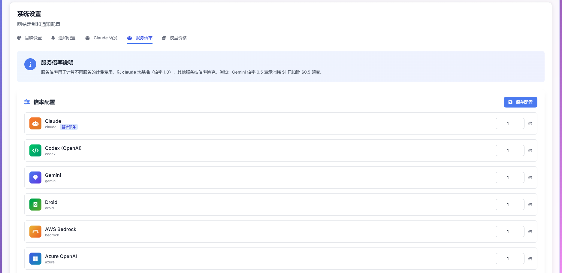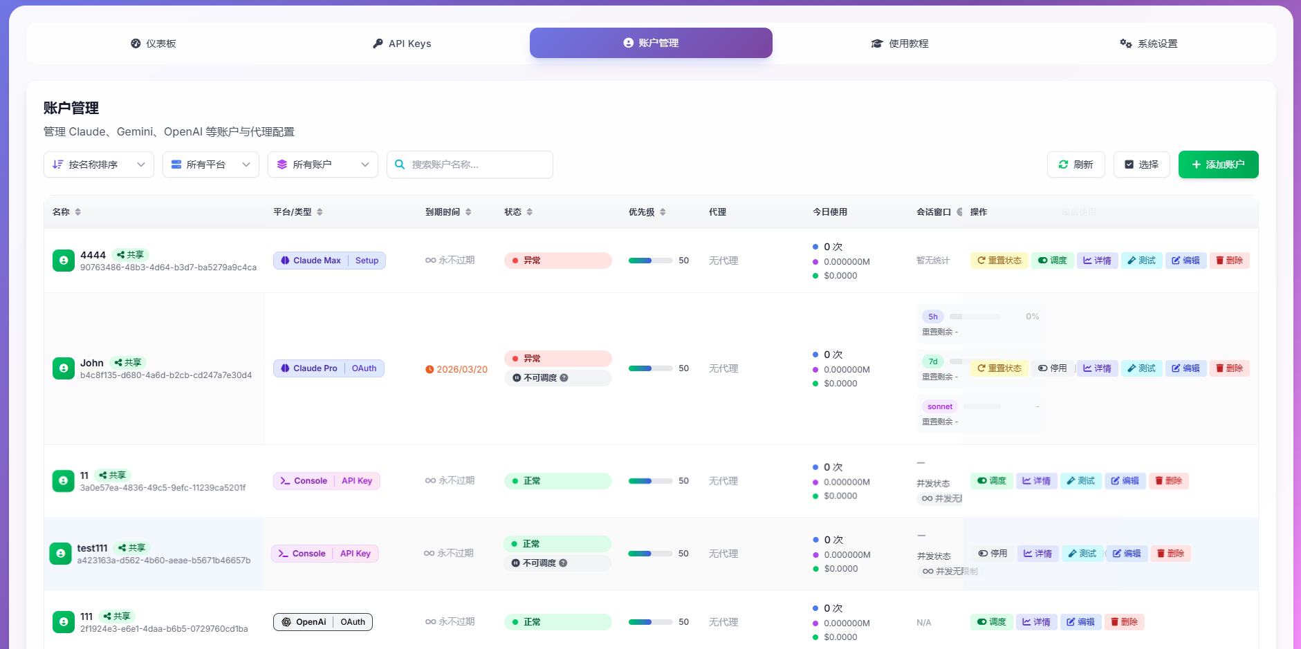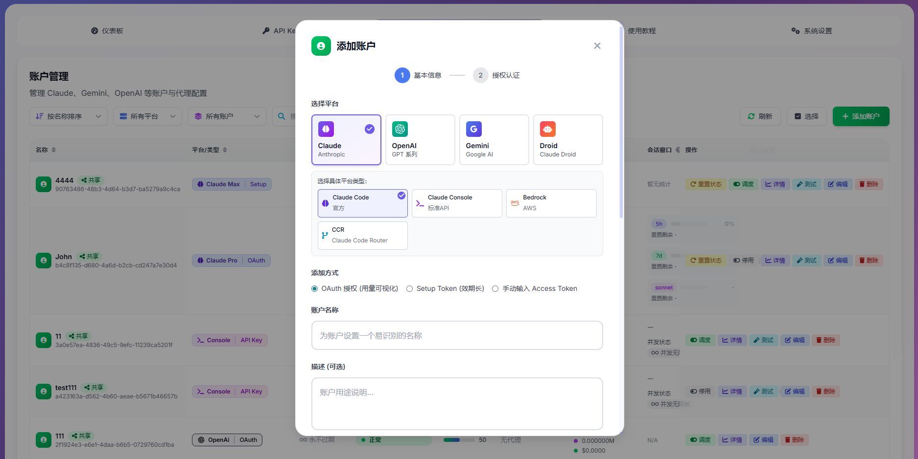 - 多账户智能调度:支持添加多个 Claude、OpenAI、Gemini、Droid 账户,支持自动轮换使用,账户异常时自动切换备用账户