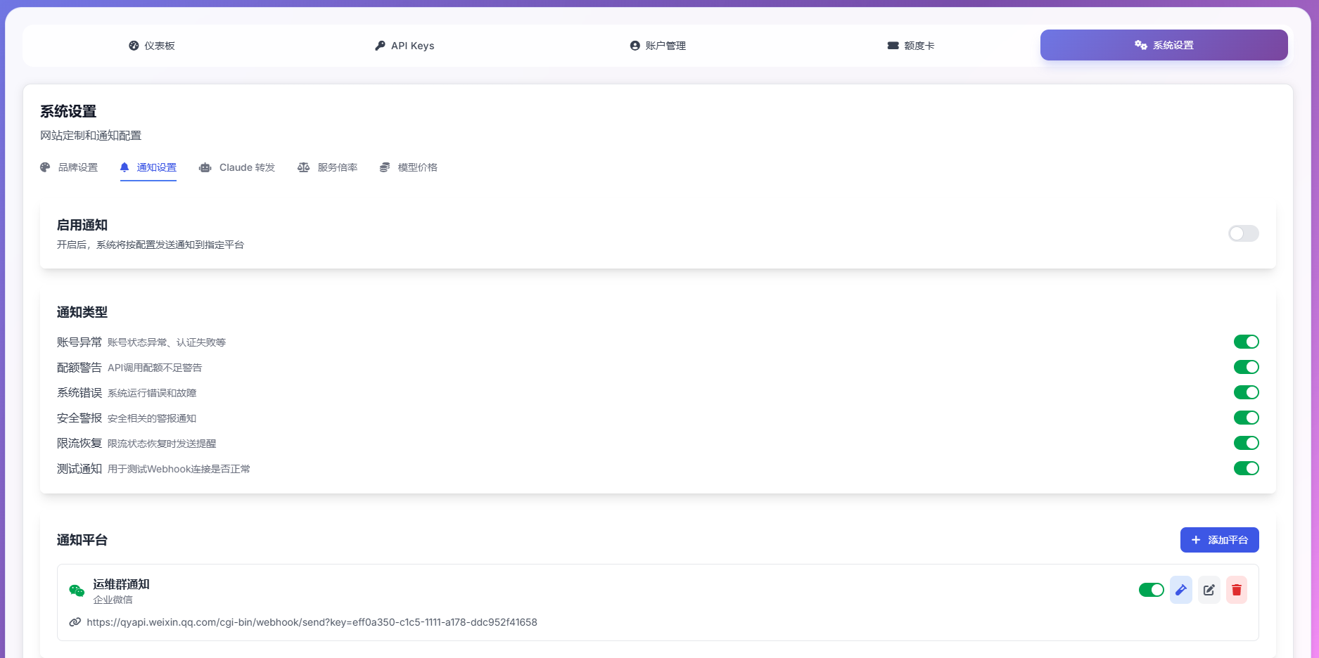 - 多渠道告警通知:当出现账户异常、额度不足、请求超时,触发预警通知,支持企业微信、钉钉、飞书、Slack、Discord、SMTP 邮件等多平台 Webhook 通知
