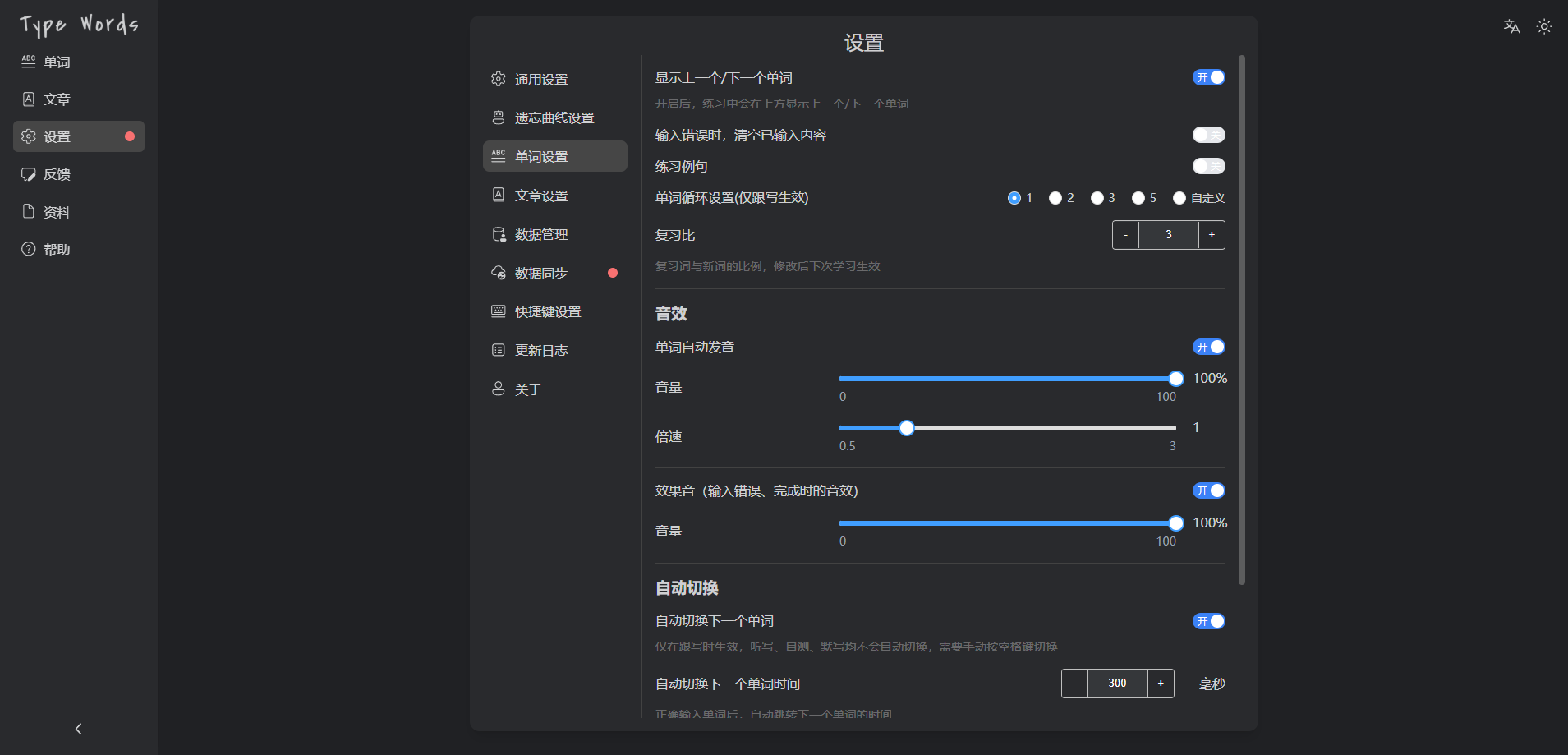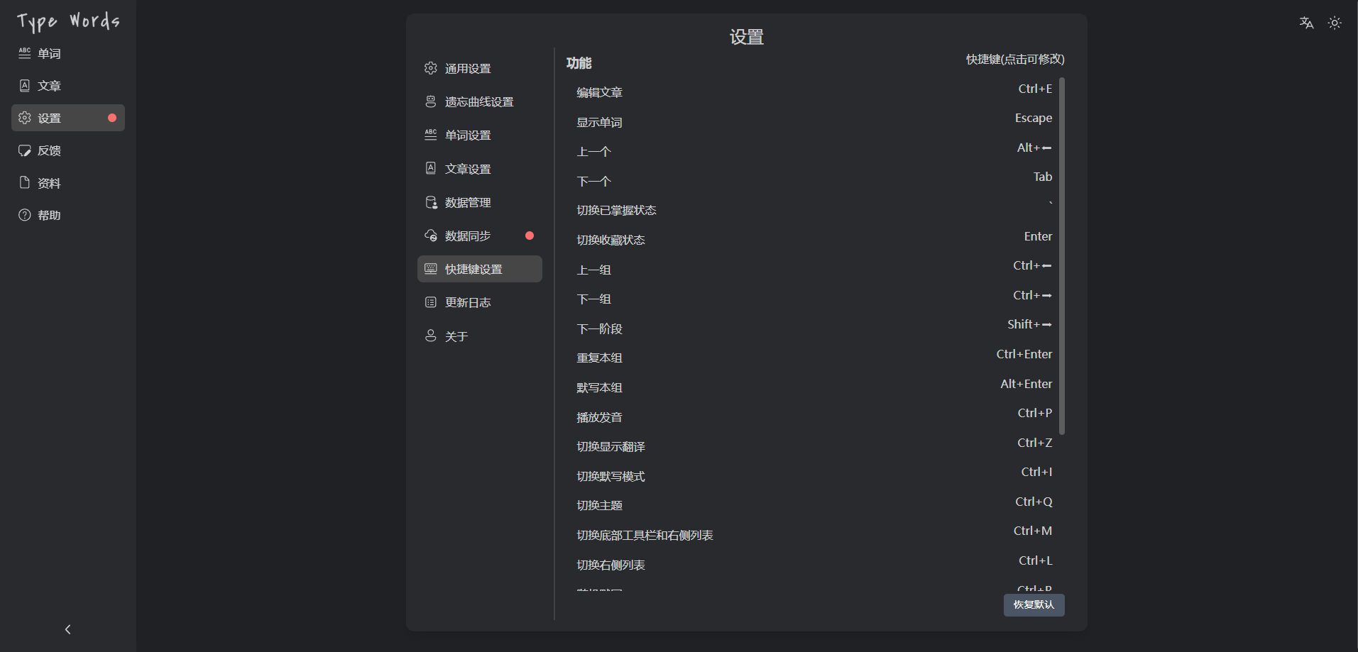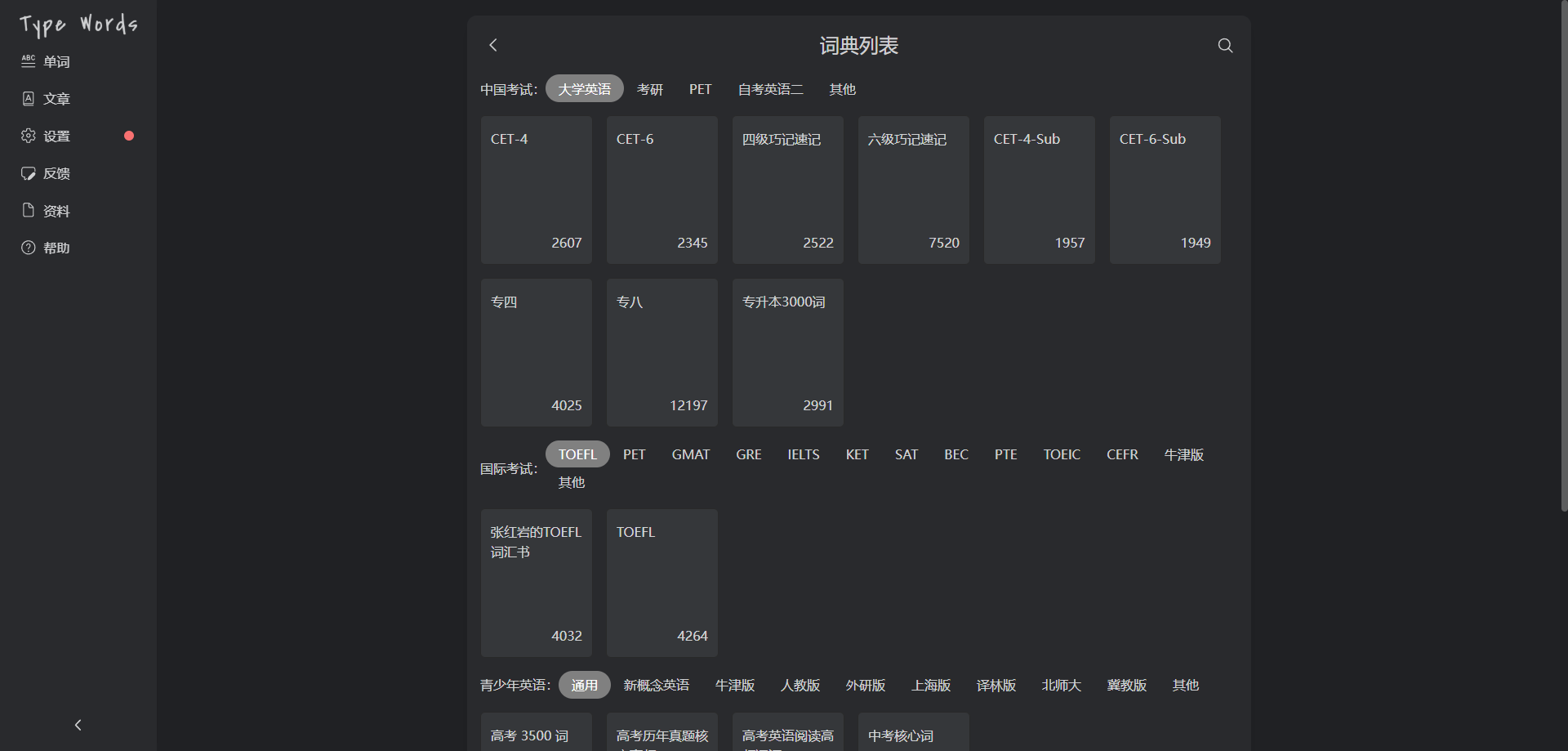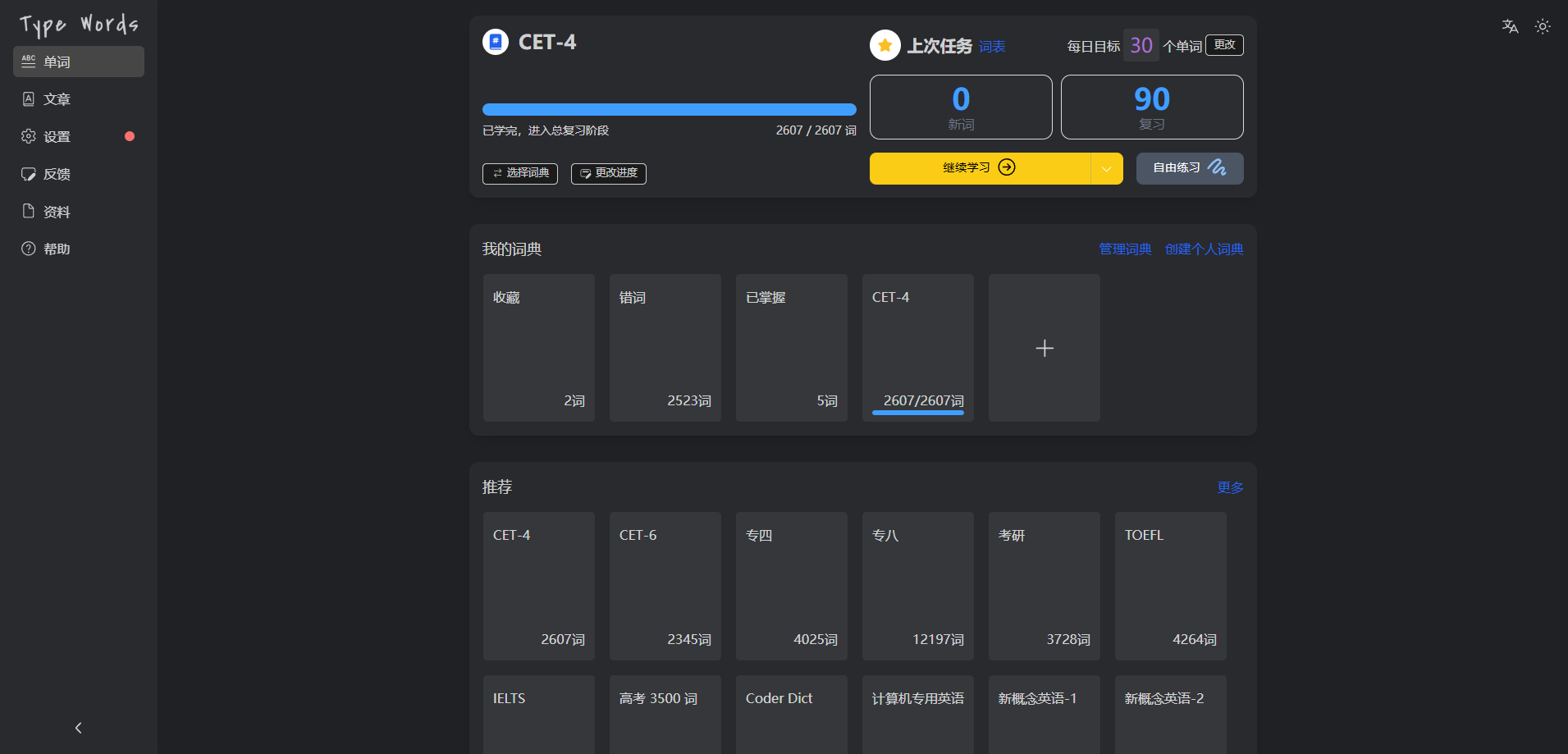 TypeWords —— 一款开源的单词与文章练习工具,使用按键输入的方式学习英语,通过更智能的记忆方式实现高效学习,界面简洁且功能丰富。
