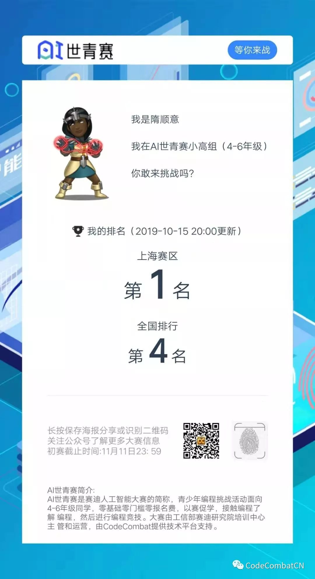 随后AI世青赛一级域名 aiyouth.org.cn 投入运行,自9月9日开赛以来,吸引了来自全国31个省市近7020名参赛选手的积极参与 !