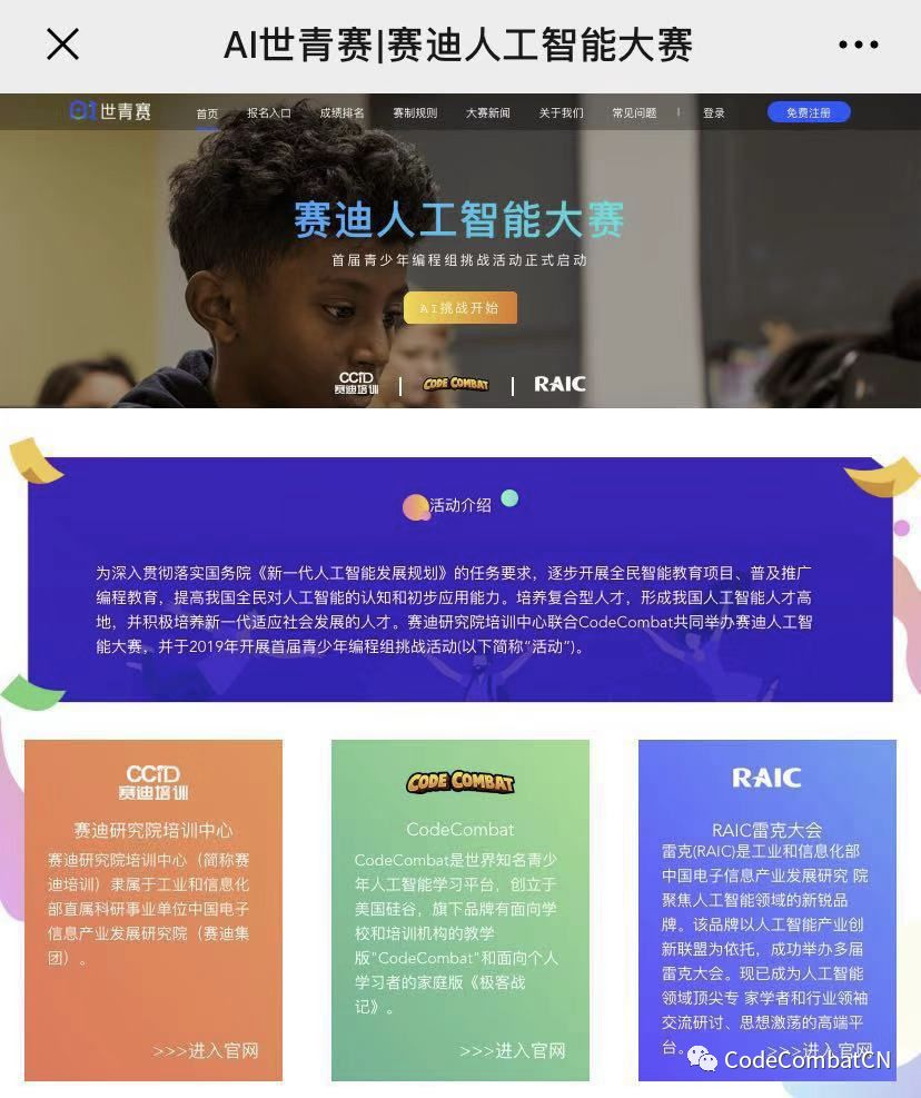 由中国计算机行业协会、赛迪工业和信息化研究院培训中心、人工智能产业创新联盟和 CodeCombat 扣哒世界共同主办的赛迪人工智能大赛·少年编程组挑战赛(简称“AI世青赛”)于2019年8月30日在赛迪产业园正式启动。作为大赛唯一指定竞技平台,CodeCombat 大中华区首席执行官王成仓携团队来到现场;人工智能产业创新联盟秘书长安晖、赛迪研究院培训中心主任冯钢,以及来自北京、上海、深圳、重庆、浙江、青岛、宁夏、河南、福建、辽宁、内蒙古、福建、新疆等地的协办单位领导出席启动仪式。