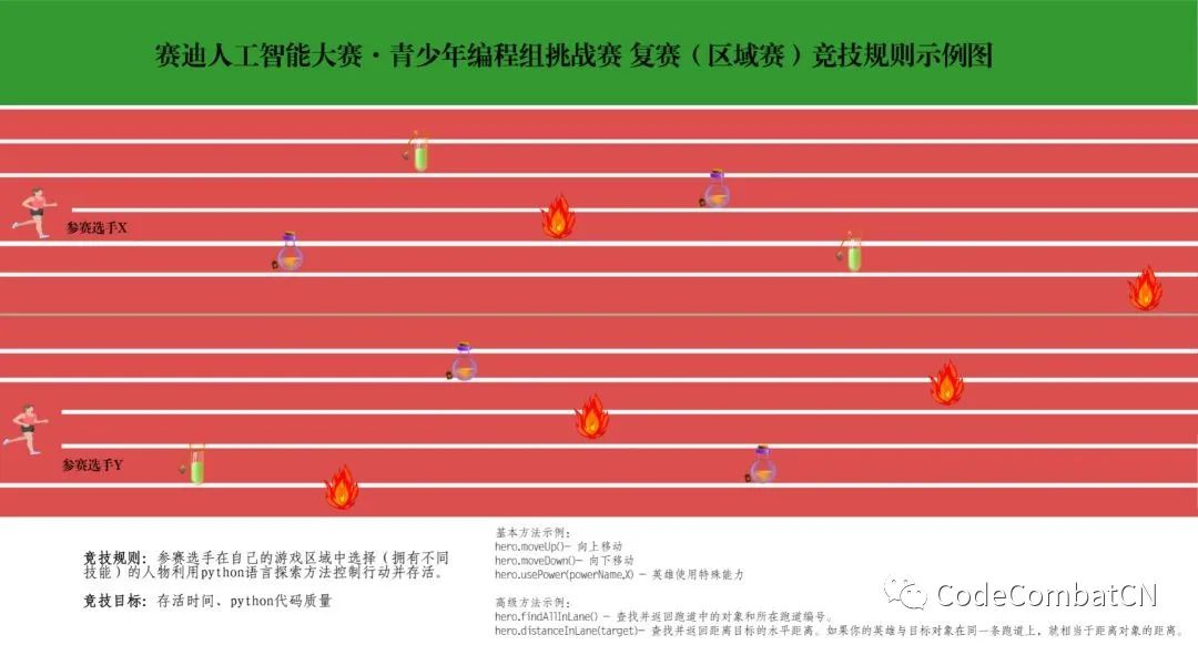 大赛复赛竞技场以游戏场景化的模式,主要考察参赛选对简单python语言的灵活运用及逻辑判断能力。 竞赛场景为:参赛选手选择英雄后从各自布有障碍物/金币/药水的跑道起点同时出发。参赛选手的英雄会不断向跑道终点移动。参赛选手需要躲避障碍物(或摧毁它们),并收集特殊能力的金币和药水以补充生命值(HP)。