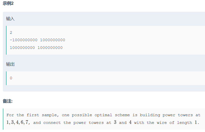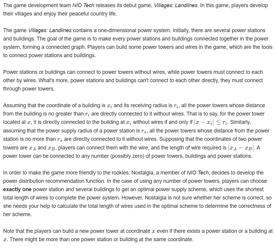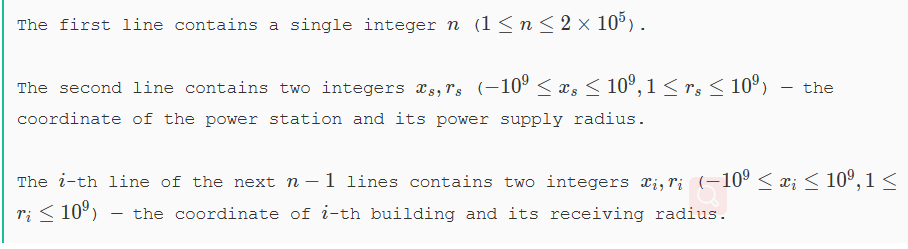 做法:我们将所有坐标及半径看成n个坐标轴上的区间,假设发电站的范围内有无数个变电塔,我们就只需要计算从左到右的区间中不连通区域的长度,这个长度就是所要求的导线长度。在输入时,我们将坐标x与半径r转化为区间的左右端点[x-r.x+r],然后对所有区间进行排序,再扫一遍找到区间中不连通区域的长度即可。