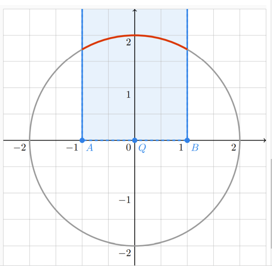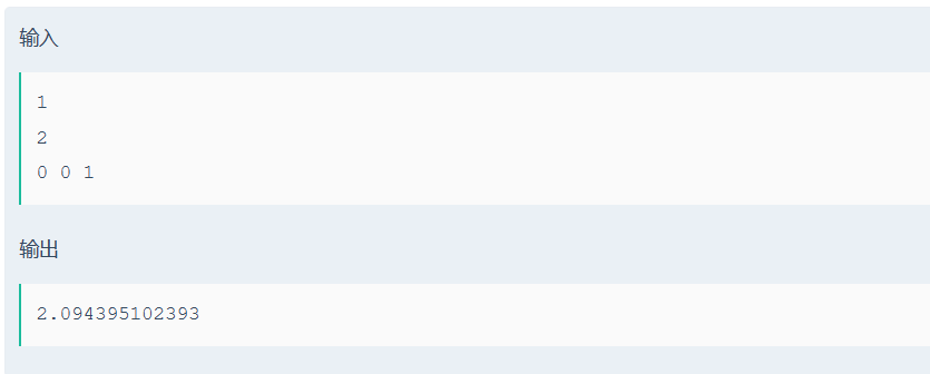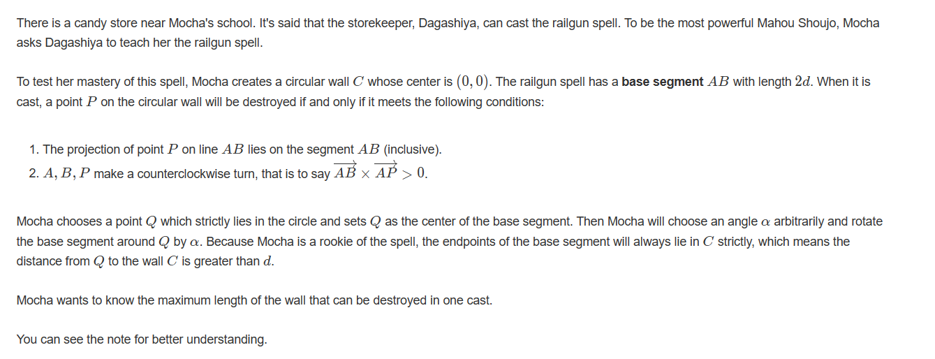 #include <bits/stdc++.h> #define int long long const int N=10000010; const double pi = acos(-1); using namespace std; signed main() { int t; cin>>t; while(t--) { double r; double x, y, d; cin>>r>>x>>y>>d; double dis = sqrt(x * x + y * y); double a1 = acos((d - dis) / r); double a2 = acos((d + dis) / r); double a3 = pi - a1 - a2; printf("%.12lf\n",a3 * r); } return 0; }