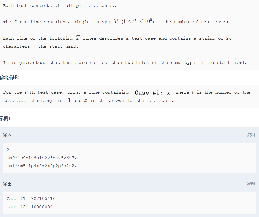 #include <bits/stdc++.h> #define int long long using namespace std; const int N=10000010; map<string,int> mp; int dp[10][150]; const int mod = 1e9 + 7; int qmi(int a,int b) { int res = 1; while(b) { if(b & 1) { res = res * a % mod; } a = a * a % mod; b >>= 1; } return res; } void core() { for(int i = 6;i >= 0;i -- ) { int good = (13 - i * 2) * 3; for(int j = good;j <= 123;j ++ ) { int bad = j - good; int fact = qmi(j, mod - 2); dp[i][j] = (dp[i + 1][j - 1] * good % mod *fact % mod + dp[i][j - 1] * bad % mod * fact % mod + 1) % mod; } } } signed main() { core(); int t; cin>>t; for(int i=1;i<=t;i++) { string s; cin>>s; mp.clear(); int sum = 0; string ss; for(int i = 0;i < s.size();i += 2 ) { ss = ""; ss += s[i]; ss += s[i + 1]; mp[ss] ++; if(mp[ss] > 1) { sum ++; } } printf("Case #%lld: %lld\n",i,dp[sum][123]); } }