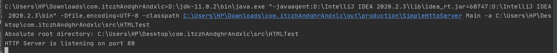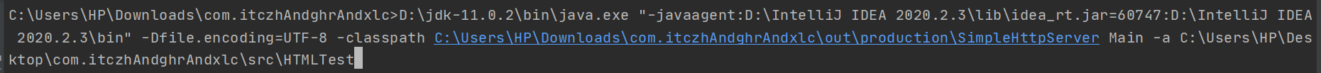 D:\jdk-11.0.2\bin\java.exe "-javaagent:D:\IntelliJ IDEA 2020.2.3\lib\idea_rt.jar=60747:D:\IntelliJ IDEA 2020.2.3\bin" -Dfile.encoding=UTF-8 -classpath C:\Users\HP\Downloads\com.itczhAndghrAndxlc\out\production\SimpleHttpServer Main