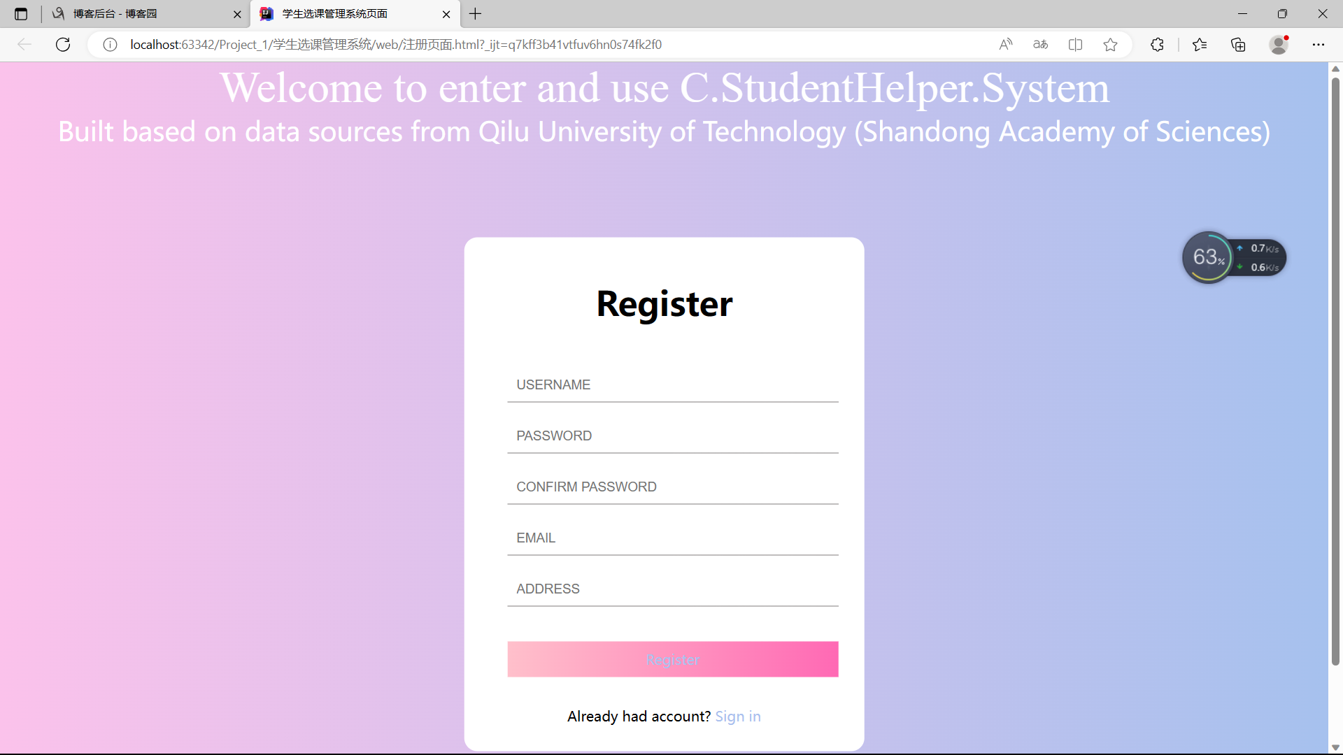 <!DOCTYPE html> <html lang="en"> <head> <meta charset="UTF-8"> <meta name="viewport" content="width=device-width, initial-scale=1.0"> <title>学生选课管理系统页面</title> <style> * { margin: 0; padding: 0; } html { height: 100%; } body { height: 100%; } .container { height: 100%; background-image: linear-gradient(to right, #fbc2eb, #a6c1ee); } .login-wrapper { background-color: #fff; width: 358px; height: 588px; border-radius: 15px; padding: 0 50px; position: relative; left: 50%; top: 50%; transform: translate(-50%, -50%); } .header { font-size: 38px; font-weight: bold; text-align: center; line-height: 150px; } .input-item { display: block; width: 100%; margin-bottom: 20px; border: 0; padding: 10px; border-bottom: 1px solid rgb(128, 125, 125); font-size: 15px; outline: none; } .input-item::placeholder { text-transform: uppercase; } .btn { text-align: center; padding: 10px; width: 100%; margin-top: 40px; background-image: linear-gradient(to right, #a6c1ee, #fbc2eb); color: #fff; } .msg { text-align: center; line-height: 88px; } a { text-decoration-line: none; color: #abc1ee; } .header1{ text-align: -webkit-center; font-family: "Times New Roman"; font-size: 50px; } .btn1 { text-align: center; width: 100%; background-image: linear-gradient(to left, #a6c1ee, #fbc2eb); color: #fff; } .header2{ text-align: -webkit-center; font-size: 30px; } .btn2 { text-align: center; padding: 10px; width: 100%; margin-top: 40px; background-image: linear-gradient(to right, pink, hotpink); color: #fff; } </style> </head> <body> <div class="btn1"> <div class="header1">Welcome to enter and use C.StudentHelper.System<br></div> <div class="header2">Built based on data sources from Qilu University of Technology (Shandong Academy of Sciences)</div> </div> <div class="container"> <div class="login-wrapper"> <div class="header">Register<br></div> <div class="form-wrapper"> <input type="text" name="username" placeholder="username" class="input-item"> <input type="password" name="password" placeholder="password" class="input-item"> <input type="password" name="confirm password" placeholder="confirm password" class="input-item"> <input type="text" name="email" placeholder="email" class="input-item"> <input type="text" name="adddress" placeholder="address" class="input-item"> <div class="btn2"><a href="登入界面.html">Register</a></div> <!-- <input type="submit" value="Register" name="Register">--> </div> <div class="msg"> Already had account? <a href="登入界面.html">Sign in</a> </div> </div> </div> </body> </html>