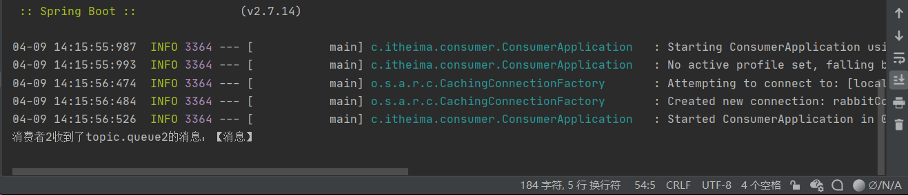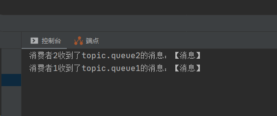 @RabbitListener(queues = "topic.queue1") public void listenTopicQueue1(String msg) throws InterruptedException { System.out.println("消费者1收到了topic.queue1的消息:【" + msg + "】"); } @RabbitListener(queues = "topic.queue2") public void listenTopicQueue2(String msg) throws InterruptedException { System.out.println("消费者2收到了topic.queue2的消息:【" + msg + "】"); }