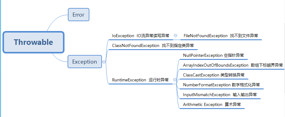 - Exception 通常情况下是可以被程序处理的,应尽可能的去处理这些异常