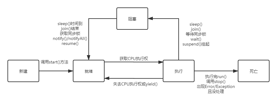 死亡:完成它的全部工作或线程提前被强制性的终止,异常导致结束;