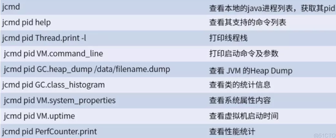 jcmd 可以查看 JVM 信息,常用的命令内容如下: