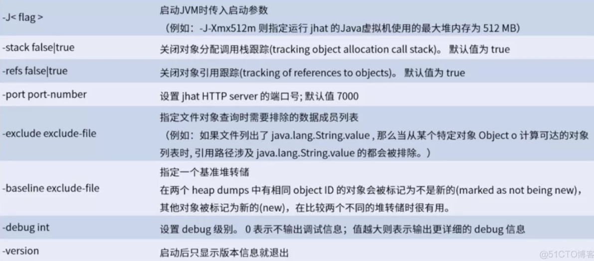 jhat 分析 Java 堆的命令,可以将堆中对象以 html 的形式显示出来,支持对象查询语言 OQL,命令内容如下: