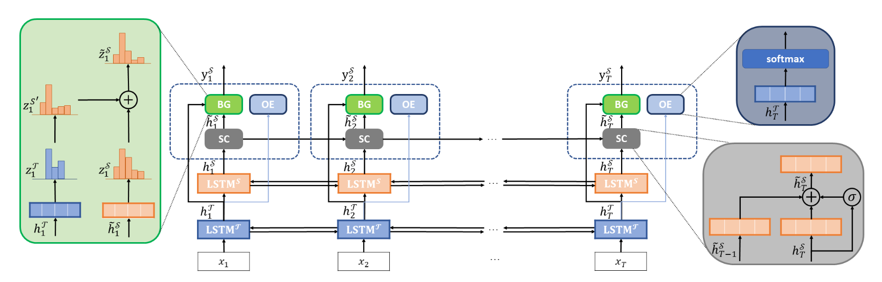 在两个堆叠的带有LSTM单元的RNN之上,我们的框架设计了三个关键组件,用标注详细描述,以探索TBSA任务中的三个重要直觉。具体来说,上标签用于完成TBSA任务并预测作为输出的统一标签,而下标签用于辅助任务并预测目标提及的边界标签。来自第一时间点的边界预测用于指导第一时间点对完整任务的统一标签进行更好的预测。