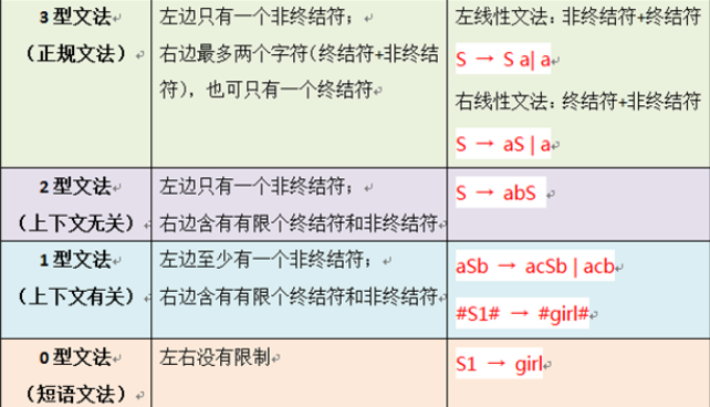 文法类型为0型文法、1型文法、2型文法、3型文法。