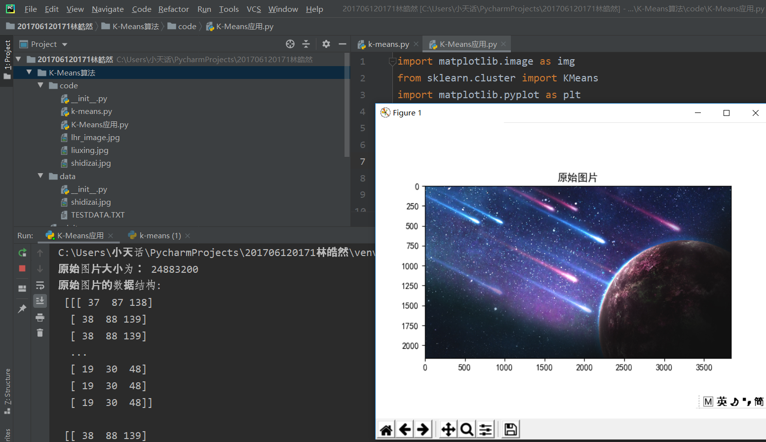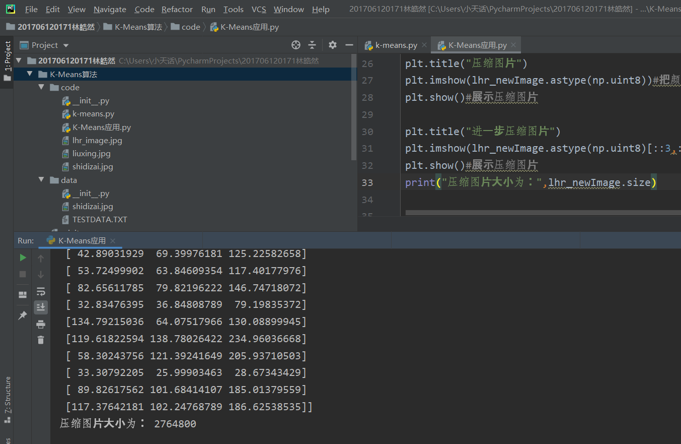 import matplotlib.image as img from sklearn.cluster import KMeans import matplotlib.pyplot as plt import numpy as np lhr_image = img.imread("liuxing.jpg") #读入图片路径 print("原始图片大小为:",lhr_image.size) print("原始图片的数据结构:\n",lhr_image) plt.rcParams['font.sans-serif'] = ['SimHei'] plt.title("原始图片") plt.imshow(lhr_image) plt.show() lhr_image=lhr_image[::3,::3] X = lhr_image.reshape(-1,3) # 进行线性化,因为只对颜色进行分类,所以丢弃位置信息 n_colors= 64#将255*255*255种颜色压缩成64种颜色 model= KMeans(n_colors)#建立模型 labels = model.fit_predict(X) #喂取数据 colors = model.cluster_centers_ #取出64个聚类中心,进行颜色值分类 lhr_newImage = colors[labels].reshape(lhr_image.shape) #以聚类中收替代原像素颜色,还原为二维 print("每个像素的类别:\n",labels) print("每个类别的颜色:\n",colors) plt.title("压缩图片") plt.imshow(lhr_newImage.astype(np.uint8))#把颜色平均值转为整数 plt.show()#展示压缩图片 plt.title("进一步压缩图片") plt.imshow(lhr_newImage.astype(np.uint8)[::3,::3])#压缩图片进一步压缩,隔3个像素选取 plt.show()#展示压缩图片 print("压缩图片大小为:",lhr_newImage.size)