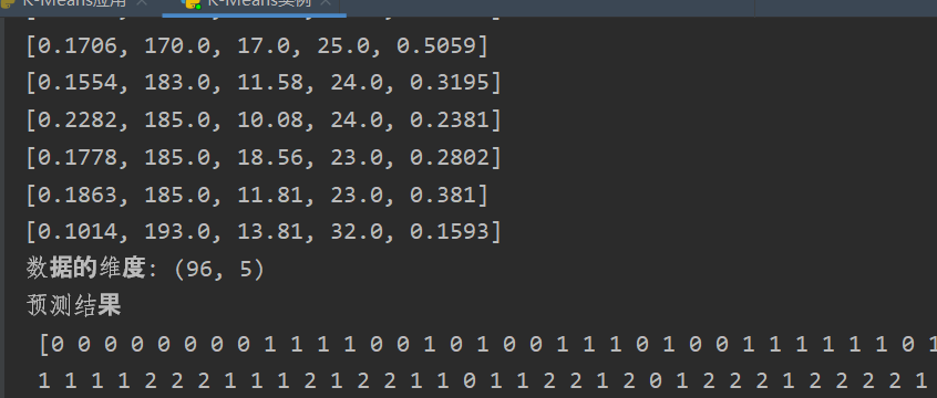 import matplotlib.pyplot as plt from sklearn.cluster import KMeans import numpy as np data = [] print("每分钟助攻数,身高,出场时间,得分,每分钟得分数") for line in open("../data/data.txt", "r").readlines(): line = line.rstrip() # 删除换行 result = ' '.join(line.split()) # strip()方法用于移除字符串头尾指定的字符(默认是空格),以,作为分隔符 s = [float(x.replace(',','')) for x in result.strip().split(' ')] print(s) # 数据累加到data里面 data.append(s) print("数据的维度:",(np.array(data)).shape) #求出第一列和第五列数据并转为list T = dict(zip([n[0] for n in data], [n[4] for n in data])) X = list(map(lambda x, y: (x, y), T.keys(), T.values())) LHR = KMeans(n_clusters=3) y_pred = LHR.fit_predict(X) # 输出聚类预测结果,96行数据,每个y_pred对应X一行或一个球员,聚成3类,类标为0、1、2 print("预测结果\n",y_pred) x1 = [] y1 = [] x2 = [] y2 = [] x3 = [] y3 = [] # 分别获取类别为0、1、2的数据分别赋值给(x1,y1) (x2,y2) (x3,y3) i = 0 while i < len(X): if y_pred[i] == 0: x1.append(X[i][0]) y1.append(X[i][1]) elif y_pred[i] == 1: x2.append(X[i][0]) y2.append(X[i][1]) elif y_pred[i] == 2: x3.append(X[i][0]) y3.append(X[i][1]) i = i + 1 plot1, = plt.plot(x1, y1, 'or', marker="*") plot2, = plt.plot(x2, y2, 'oy', marker="o") plot3, = plt.plot(x3, y3, 'ob', marker="x") # 标题 plt.rcParams['font.sans-serif'] = ['SimHei'] plt.title("201706120171林皓然--篮球球员能力分类") # 绘制x轴和y轴坐标 plt.xlabel("每分钟助攻数") plt.ylabel("每分钟得分数") # 设置图例 plt.legend((plot1, plot2, plot3), ('一流球员', '二流球员', '三流球员'), fontsize=10) plt.show()