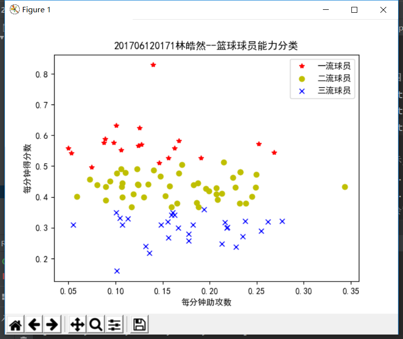 最终,得到分类结果如图所示,将97位球员数据分成了三类,区分出一流球员和二流球员以及三流球员。效果如图所示。