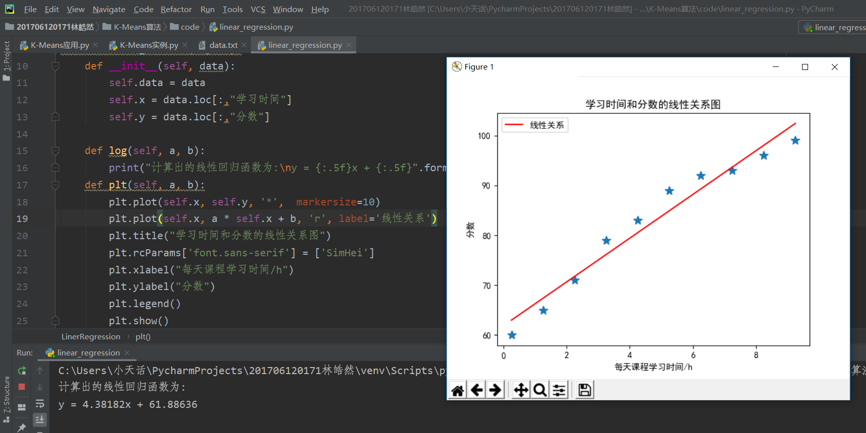 import pandas as pd data = pd.DataFrame({ '学习时间' : [i+0.25 for i in range(0,10)], '分数' : [60,65,71,79,83,89,92,93,96,99], }) import matplotlib.pyplot as plt #实现线性回归算法 class LinerRegression(object): def __init__(self, data): self.data = data self.x = data.loc[:,"学习时间"] self.y = data.loc[:,"分数"] def log(self, a, b): print("计算出的线性回归函数为:\ny = {:.5f}x + {:.5f}".format(a, b))#得出线性回归函数 def plt(self, a, b): plt.plot(self.x, self.y, '*', markersize=10) plt.plot(self.x, a * self.x + b, 'r', label='线性关系')#设置图例 plt.title("学习时间和分数的线性关系图") plt.rcParams['font.sans-serif'] = ['SimHei']#解决中文显示问题 plt.xlabel("每天课程学习时间/h")#设置x轴文字 plt.ylabel("分数")#设置y轴文字 plt.legend() plt.show() def least_square_method(self):#实现最小二乘法 def calc_ab(x, y): sum_x, sum_y, sum_xy, sum_xx = 0, 0, 0, 0 n = len(x) for i in range(0, n): sum_x += x[i] sum_y += y[i] sum_xy += x[i] * y[i] sum_xx += x[i]**2 a = (sum_xy - (1/n) * (sum_x * sum_y)) / (sum_xx - (1/n) * sum_x**2) b = sum_y/n - a * sum_x/n return a, b a, b = calc_ab(self.x, self.y) self.log(a, b) self.plt(a, b) print(data)#输出数据data model = LinerRegression(data)#构建模型 model.least_square_method()#使用最小二乘法