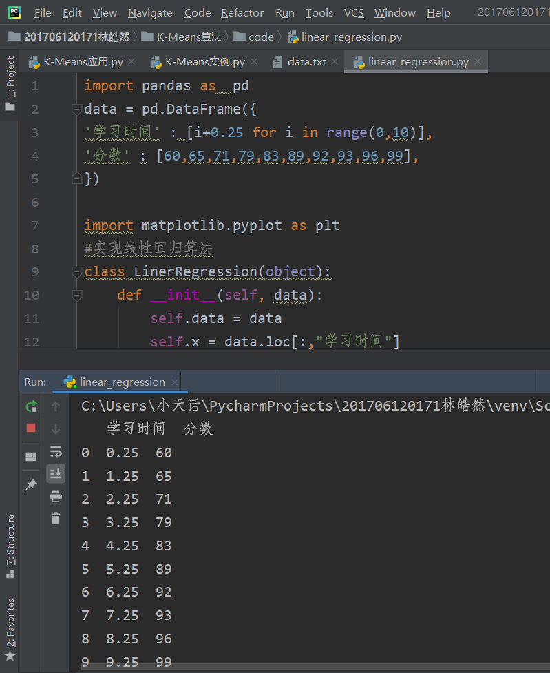 这次我自己弄了点数据,研究一下学习时间和分数之间的关系。