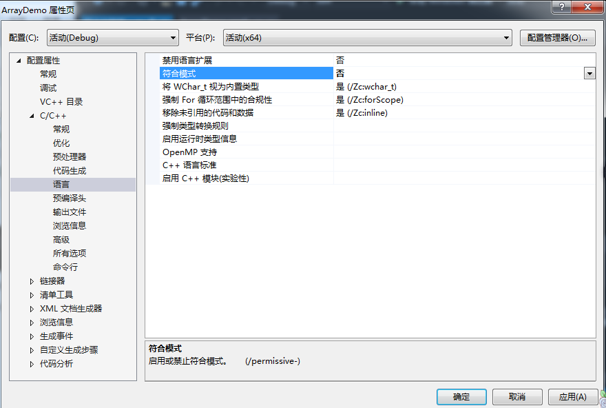 1、项目右击—>属性—>C/C++—>语言—>符合模式改成否