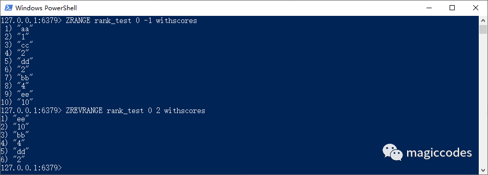Redis Zrange 返回有序集中,指定区间内的成员。其中成员的位置按分数值递增(从小到大)来排序,如果我们需要按照分数从大到小排序,则需添加WITHSCORES。如下图所示: