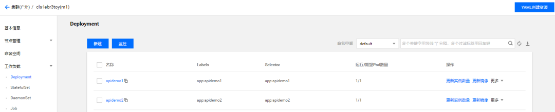 4.接下来,需要确保创建成功。我们使用上述参考的YAML分别创建Deployment“apidemo1”和“apidemo2”如下图所示: