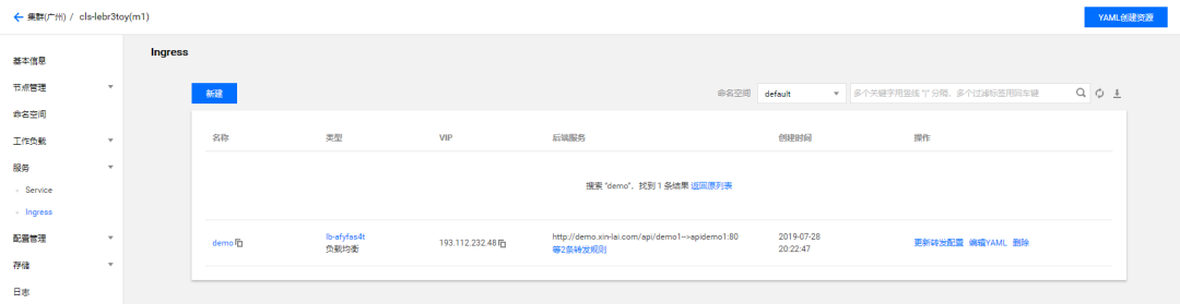 创建完成之后,腾讯云同样会自动创建负载均衡服务并且提供负载均衡IP,如下图所示,接下来我们需要将域名“demo.xin-lai.com”解析到该负载均衡IP“193.112.232.48”: